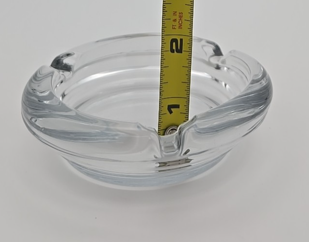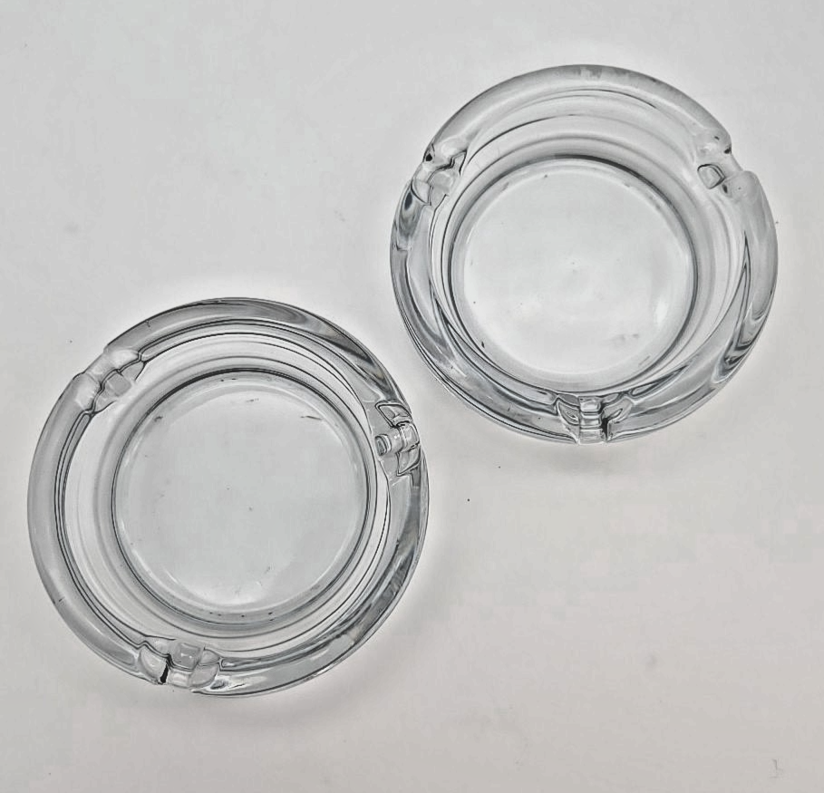 Vintage Clear Glass Round 3-Slot Ashtrays ? Heavy Pressed Glass Set of 2. This matching pair of vintage ashtrays features a classic round design with three evenly spaced cigarette rests. Made from thick, clear pressed glass, each ashtray offers durability and a timeless look suitable for display or functional use. Ideal for retro home decor, bar settings, or vintage glassware collections, these ashtrays reflect mid-century style with simple, sturdy construction.
