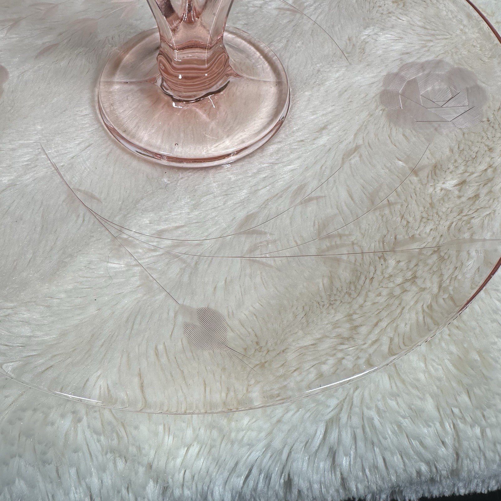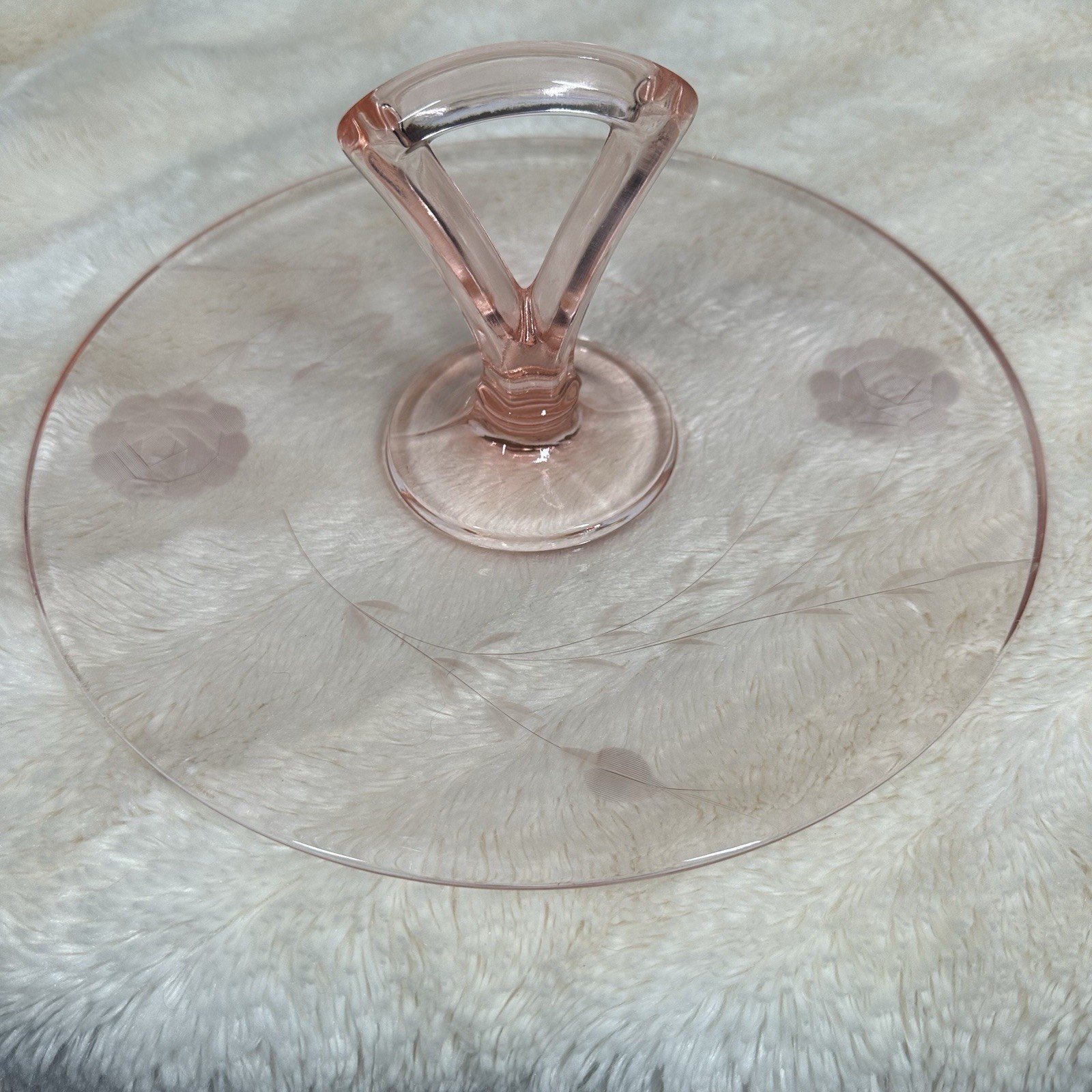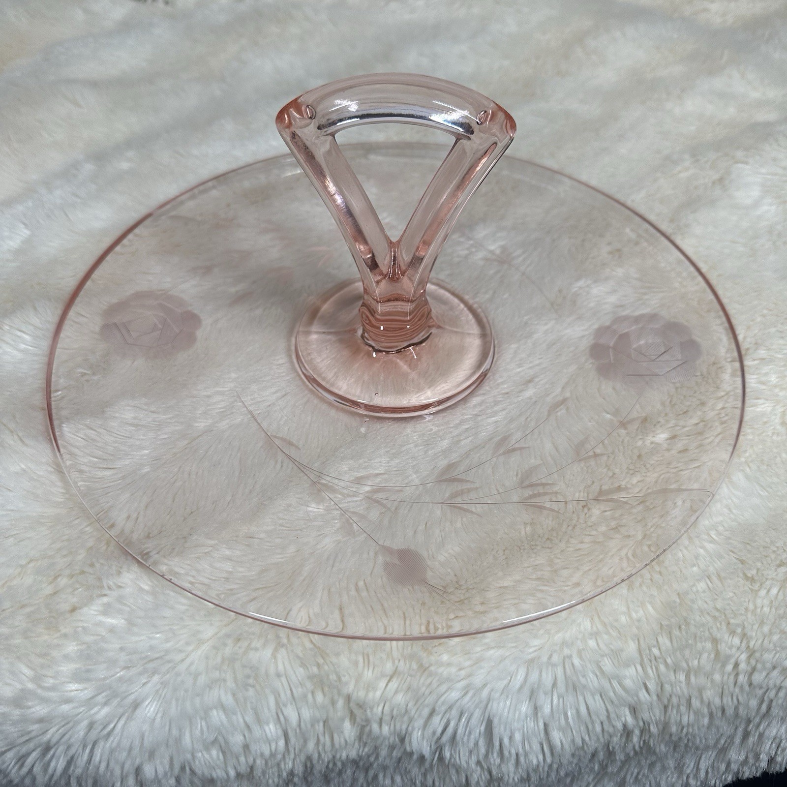 Pink Etched Depression Glass Sandwich Tid Bit Cake Tray With Center Handle