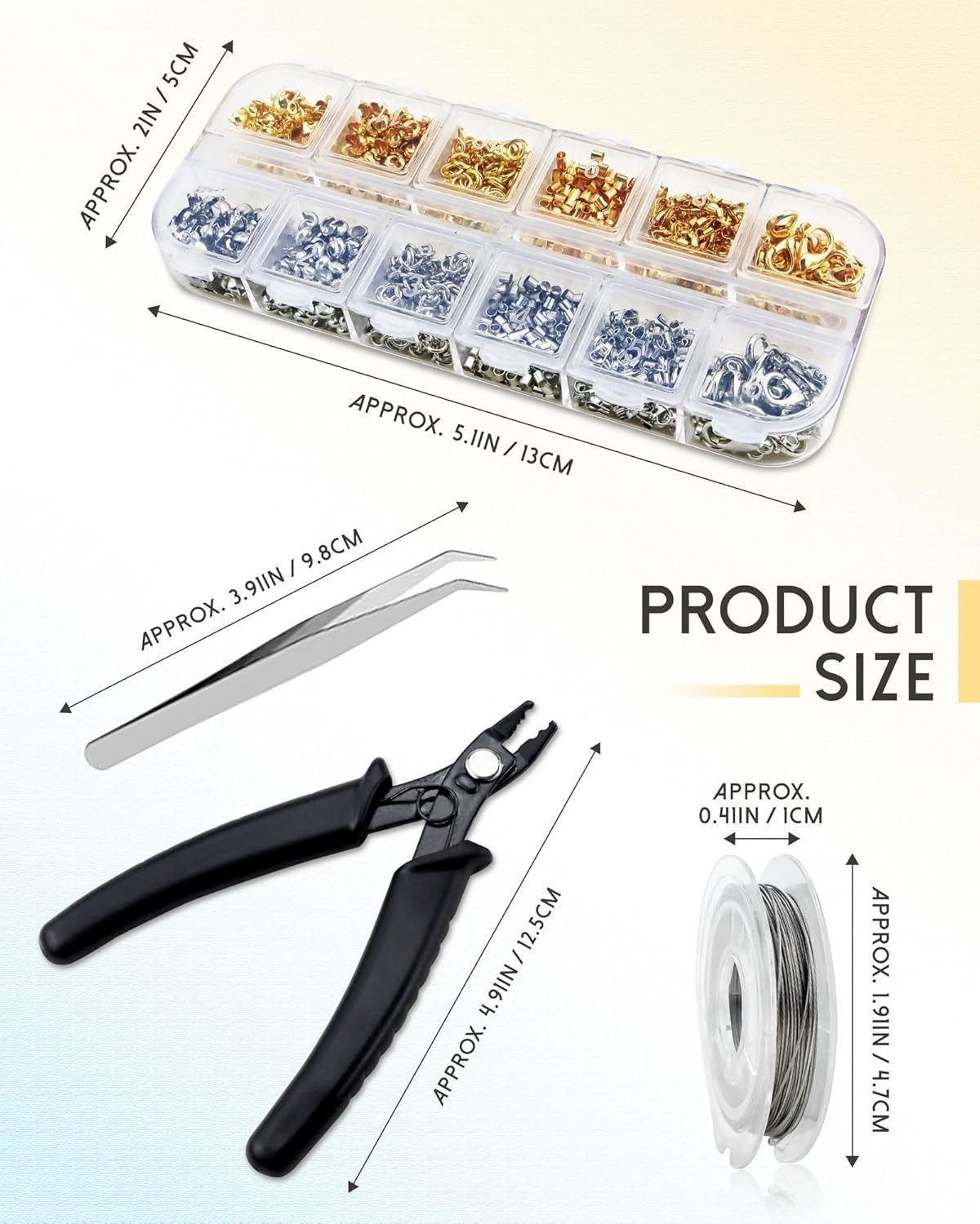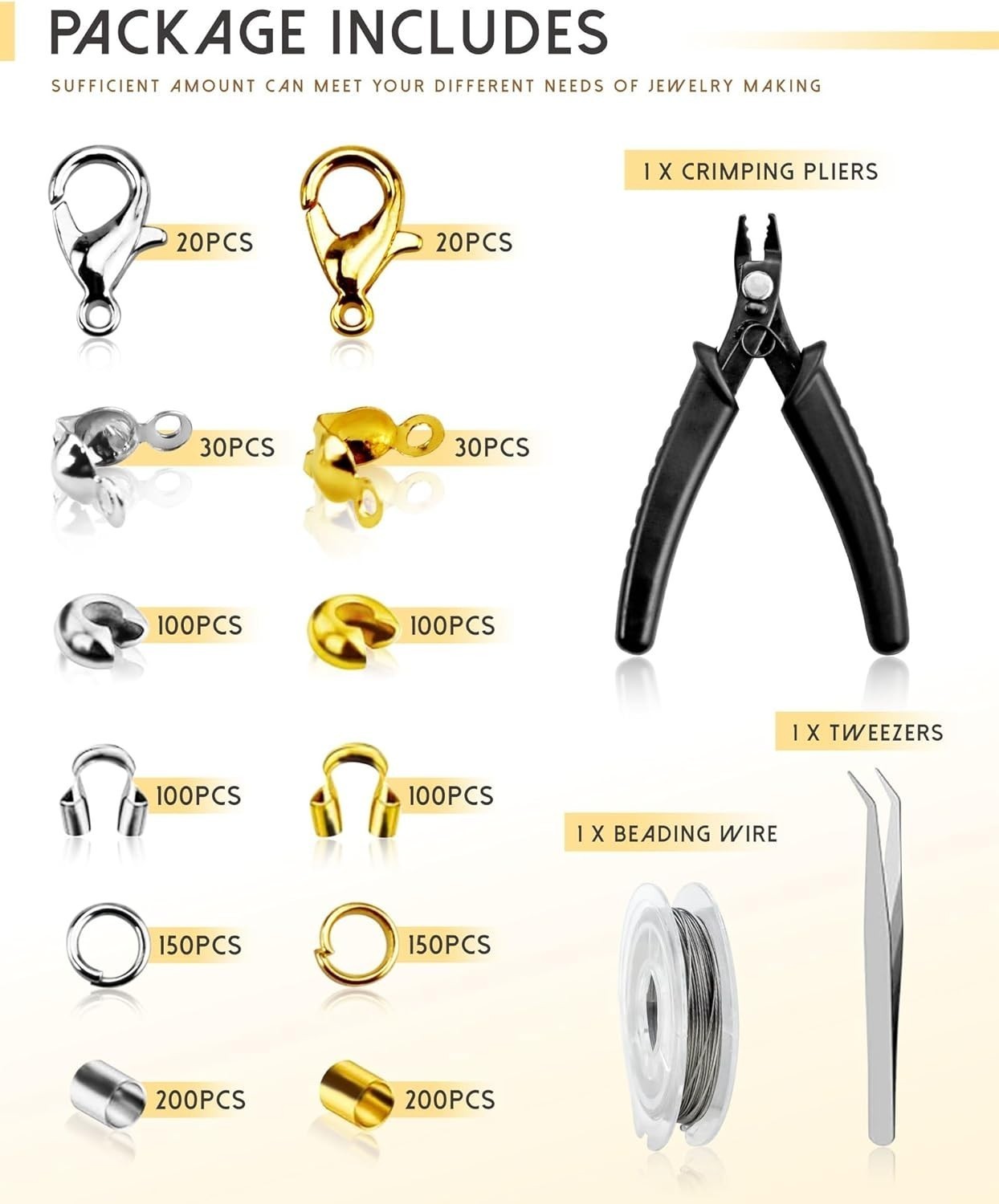 You will get a box of crimp beads supplies in 2 colors, including 400 pieces crimp tubes beads, 200 pieces crimp bead covers, 60 pieces knot covers, 200 pieces wire guardians, 40 pieces lobster clasps, 300 pieces jump rings, a crimping Pliers and 1 roll of stainless beads wire, sufficient amount can meet your different needs of jewelry making.