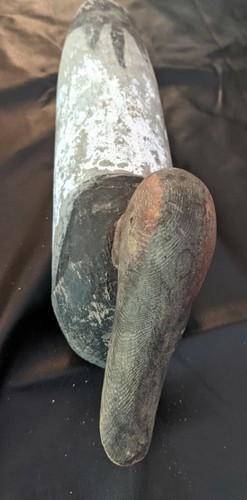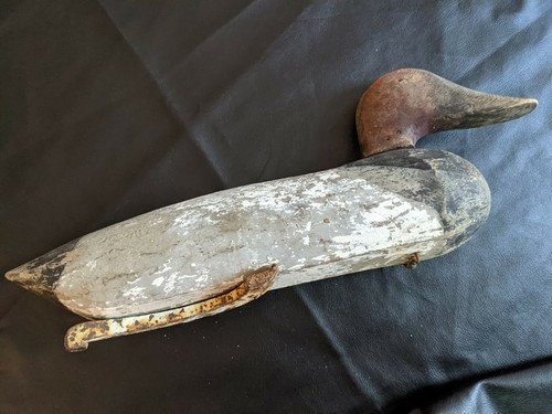 A vendre est un leurre de canard vintage art folklorique maison cloture rustique post Northern Bay. La peinture s'ecaille. La tete est lache. La base de la tete a une fissure. Le poids est une chaussure a chevaux coupee.