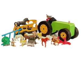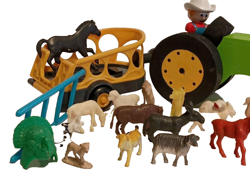 This handcrafted wooden tractor and John Deere yellow plastic trailer set is the perfect addition to any farm-themed toy collection. The set includes a detailed tractor with realistic features,The John Deere trailer has a detachable trailer with a functioning adjustable ramp. In addition to the tractor and trailer, this set also includes animals and figures to enhance the play experience. The wooden construction ensures durability and longevity, making it a great investment for collectors or young children alike.This is a preowned item with normal wear. See Pictures. NOTE THIS IS A MIXED LOT OF 20+ RANDOM PIECES,