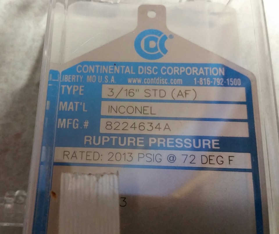 This is for 1 Continental Rupture Disc 3/16" STD (AF), ICONEL 2013 psig @ 72 Deg.. Check picture and email with any questions. This was never used or put into service, it is new in box with shelf wear condition. Liquidating excess inventory, bargain price.