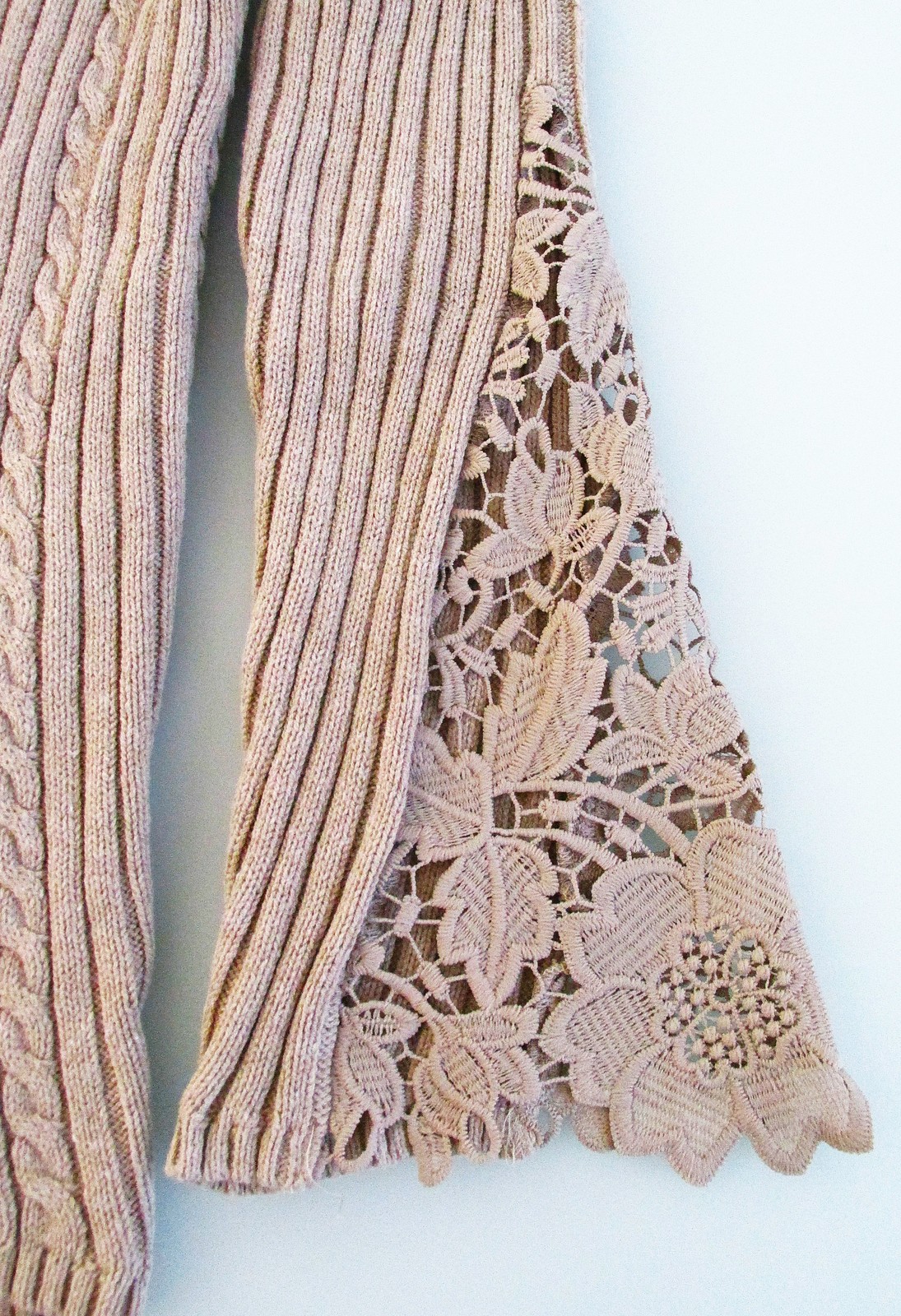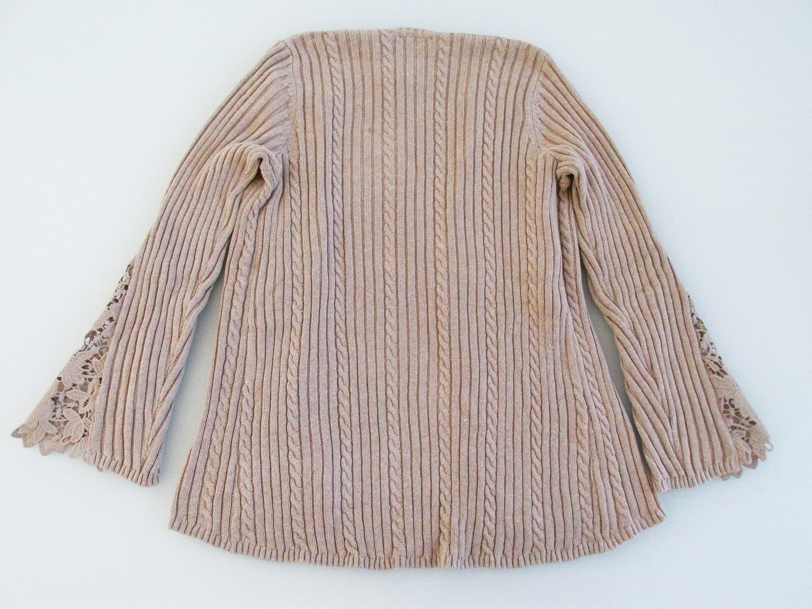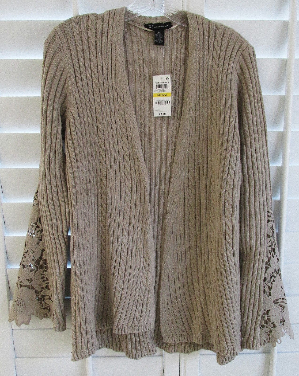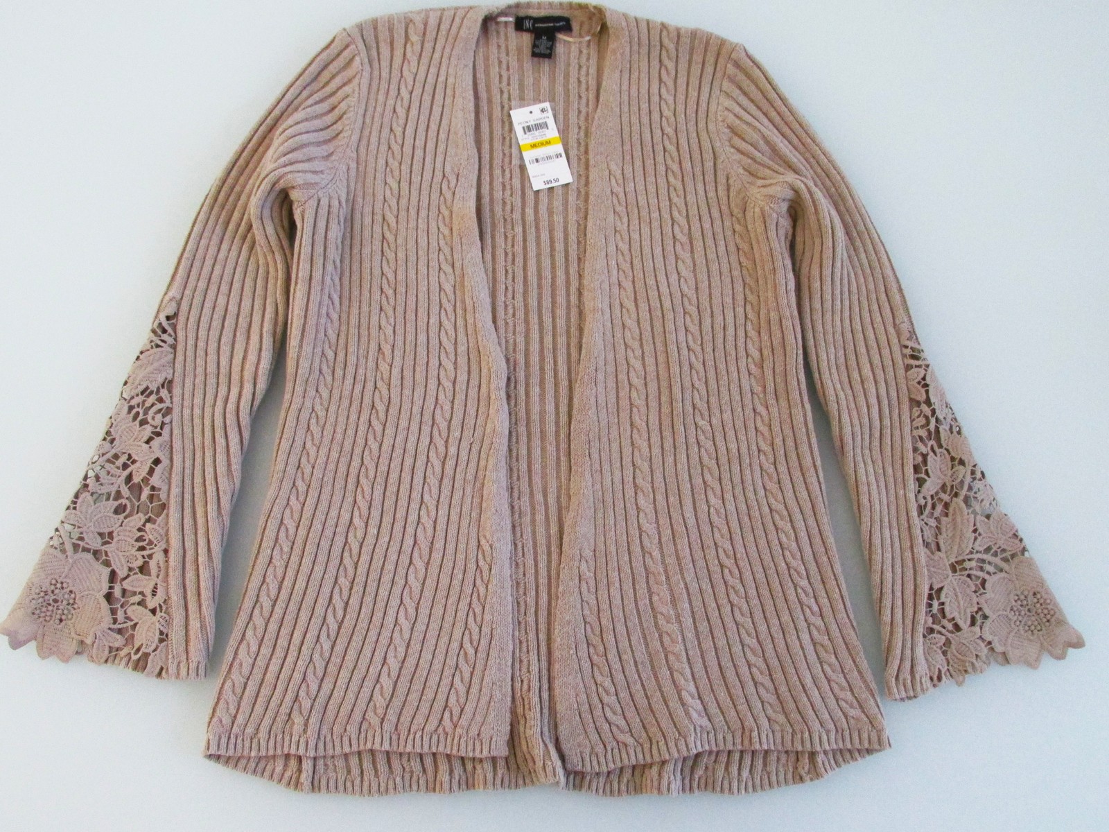 Description: Up for sale is an International Concepts (NWT) women's open-front cardigan sweater. The size is medium. The color is light tan in color.The sweater is made of 57%cotton/38%acrylic/5%nylon knit fabric. This cardigan has a ribbed design with accent cabling and features bell sleeves with crochet inserts . This open-front cardigan has an $89.50 price ticket attached.