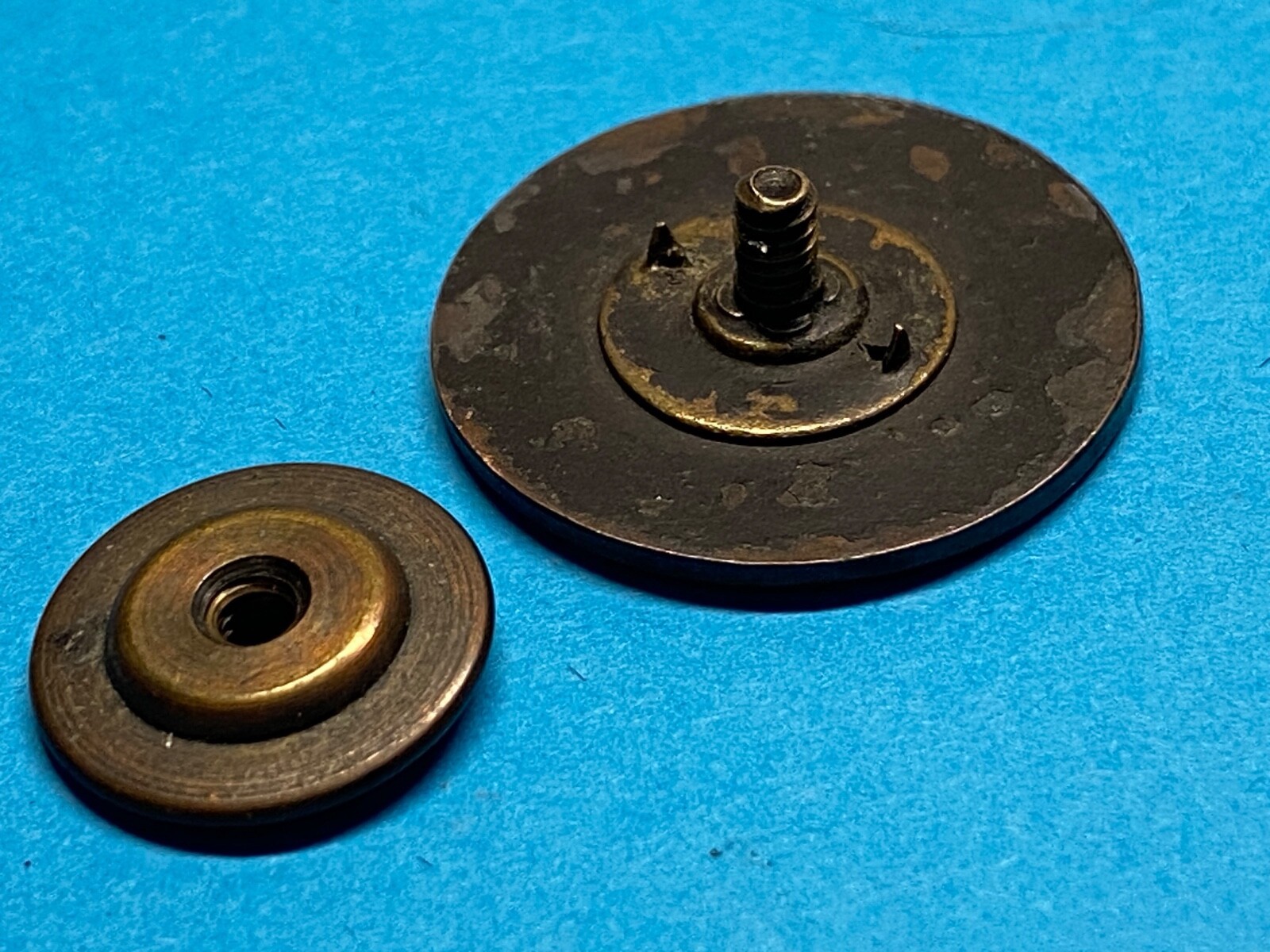 On October 8, 1907 the War Department issued Circular No. 68 that described new insignia to be worn on the standing collars of enlisted men's service uniforms. These were to have been two pairs of one inch bronze disks. On each side of the collar there was a pair, one bearing the letters U.S. and the other the branch of service. The insignia were attached by a threaded post and thumb screw nut. Older enlisted insignia that were in use were cut out emblems of the service branch similar to officer's collar insignia. The edges of the cut out insignia snagged on brush and the insignia came loose. The pins frequently broke on these and it was hoped that these new disks would be nearly indestructible. A second circular No. 78 of November 17, 1909 delayed the implementation to July 1, 1910. Not long afterward the decision was made that each soldier would wear a total of two disks rather than four with the right one being the U.S. and the left one being the branch. Certain of the disks included the regiment number and company letter on the face. The earliest of these disks are referred to as Type I disks. This type was in use from 1910-1924 and was the type used during the First World War.