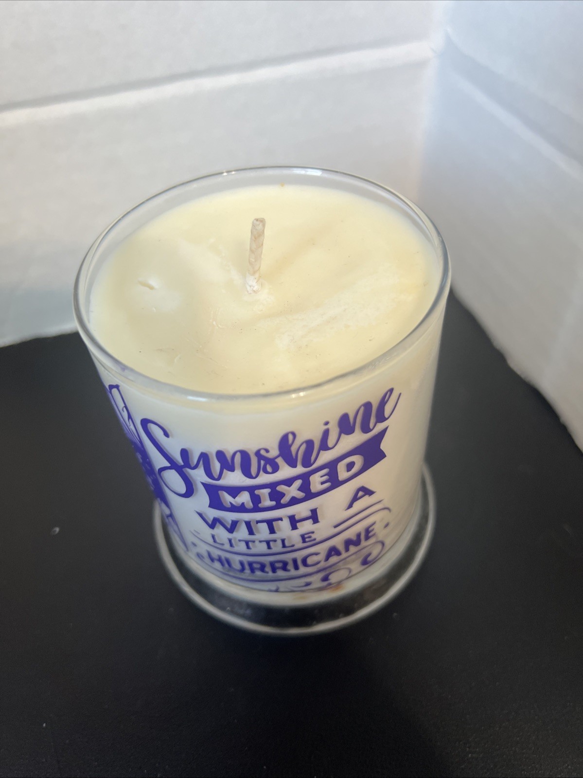 New candle with phrase decal on glass. Good condition