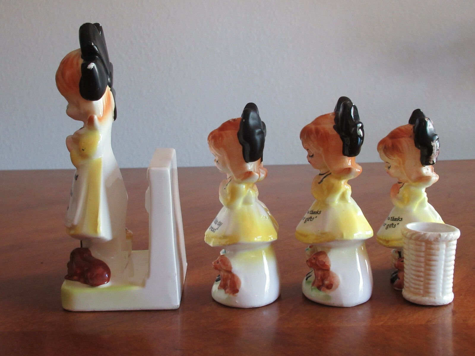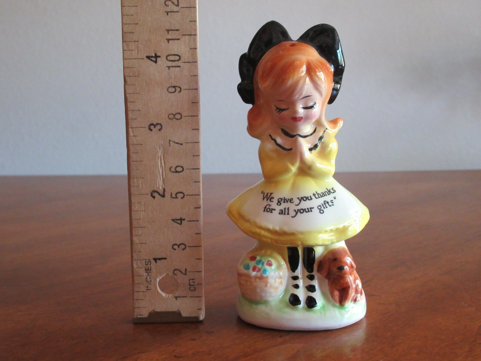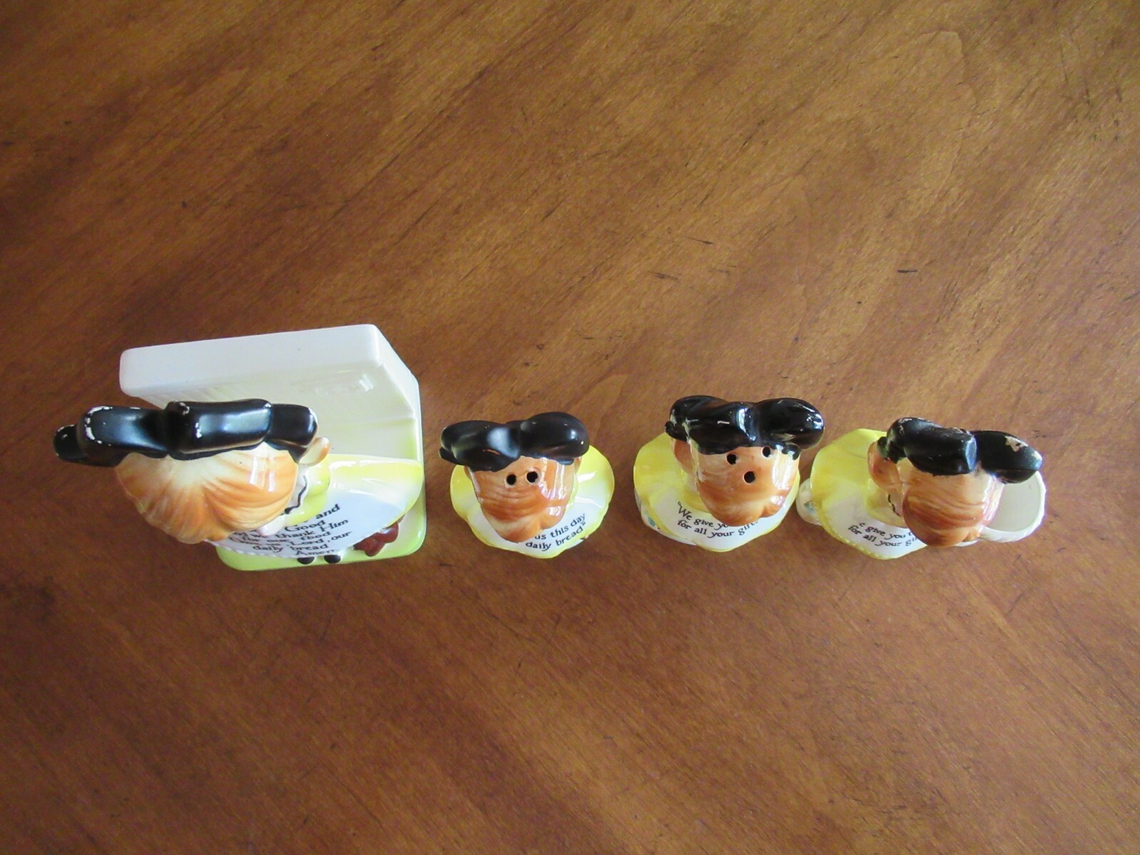 READ* Enesco Kitchen Prayer Girl Yellow Napkin Holder Salt Pepper Toothpick Vtg