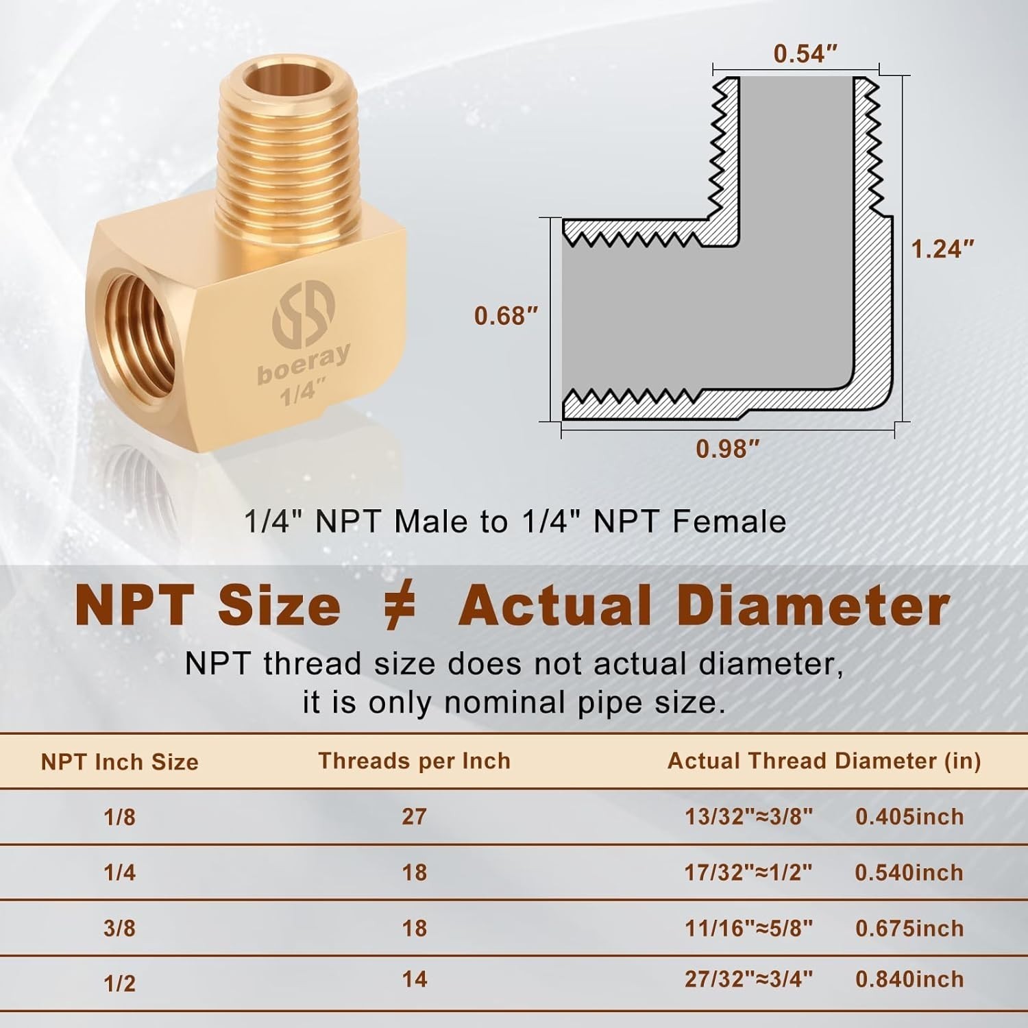 Boeray 1/4 NPT 90 degree elbow is made of high quality solid CA360 brass for corrosion resistance, ductility at high temperatures, and low magnetic permeability. Heavier weight makes the pipe fittings much stronger than steels
