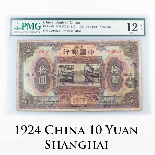 1924 10 Yuan Bank of China Note classe F-12 Net par PMG Pick 62 S / M # C294-140
