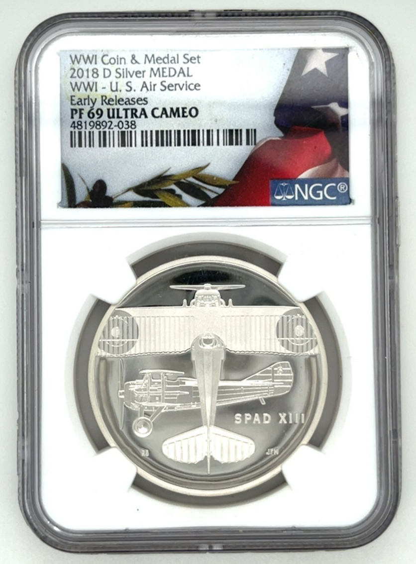 2018 D Silver Medal WW1 - US Air Service Early Restructions PF 69 Ultra Cameo