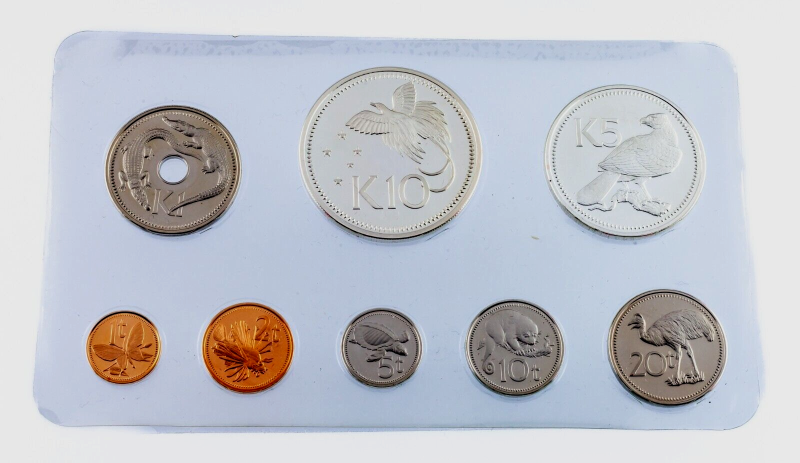 Comprend 8 pieces: 10 Kina, 5 Kina, Kina, 20 Toea, 10 Toea, 5 Toea, 2 Toea, Toea