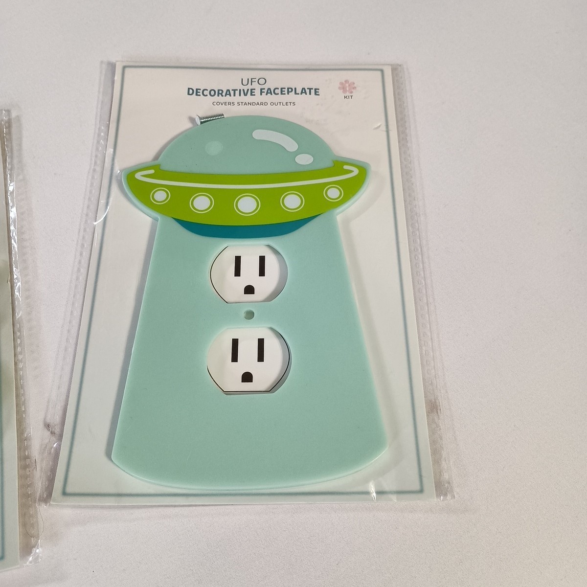 The Outlet Light Switch Covers Decorative Green UFO Faceplate Flower Cover Kit is a unique and stylish accessory for your home. Made of plastic in a vibrant green color, these custom-designed covers add a fun and creative touch to your bedroom decor. The UFO faceplate and flower cover kit is easy to install and provides a playful upgrade to your light switch and outlet covers. Perfect for those looking to add a whimsical and colorful element to their living space. Some wear to the package. See pictures.
