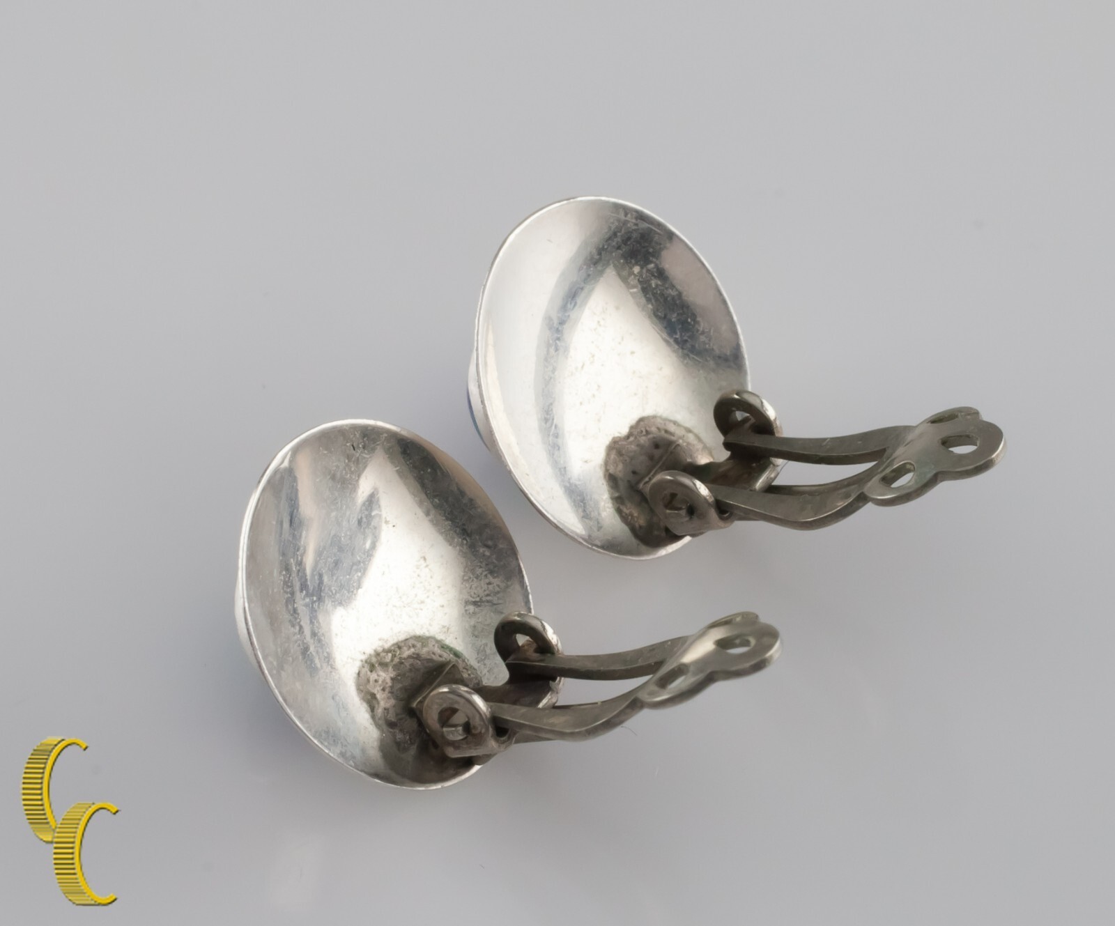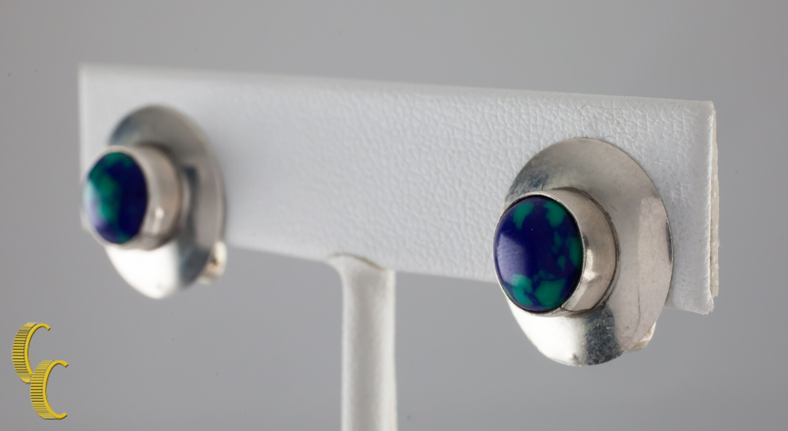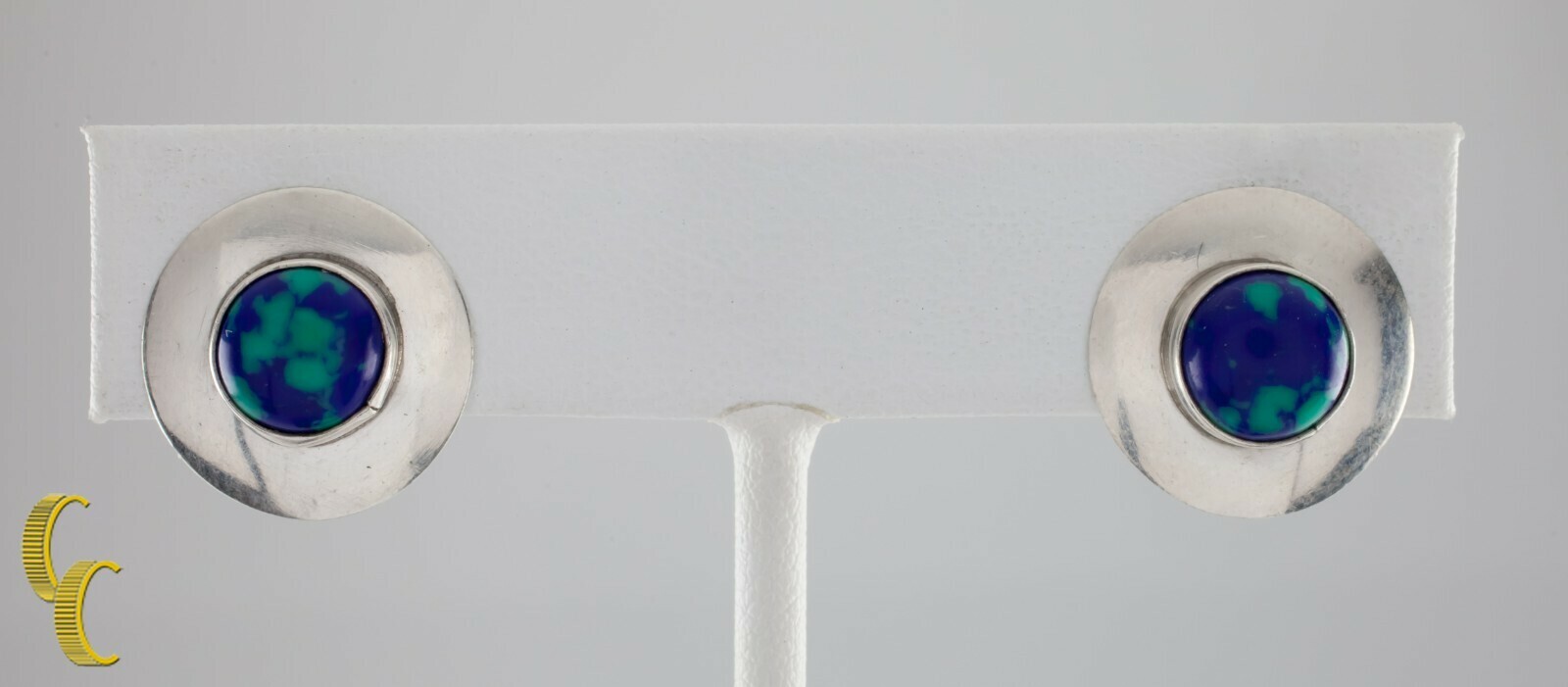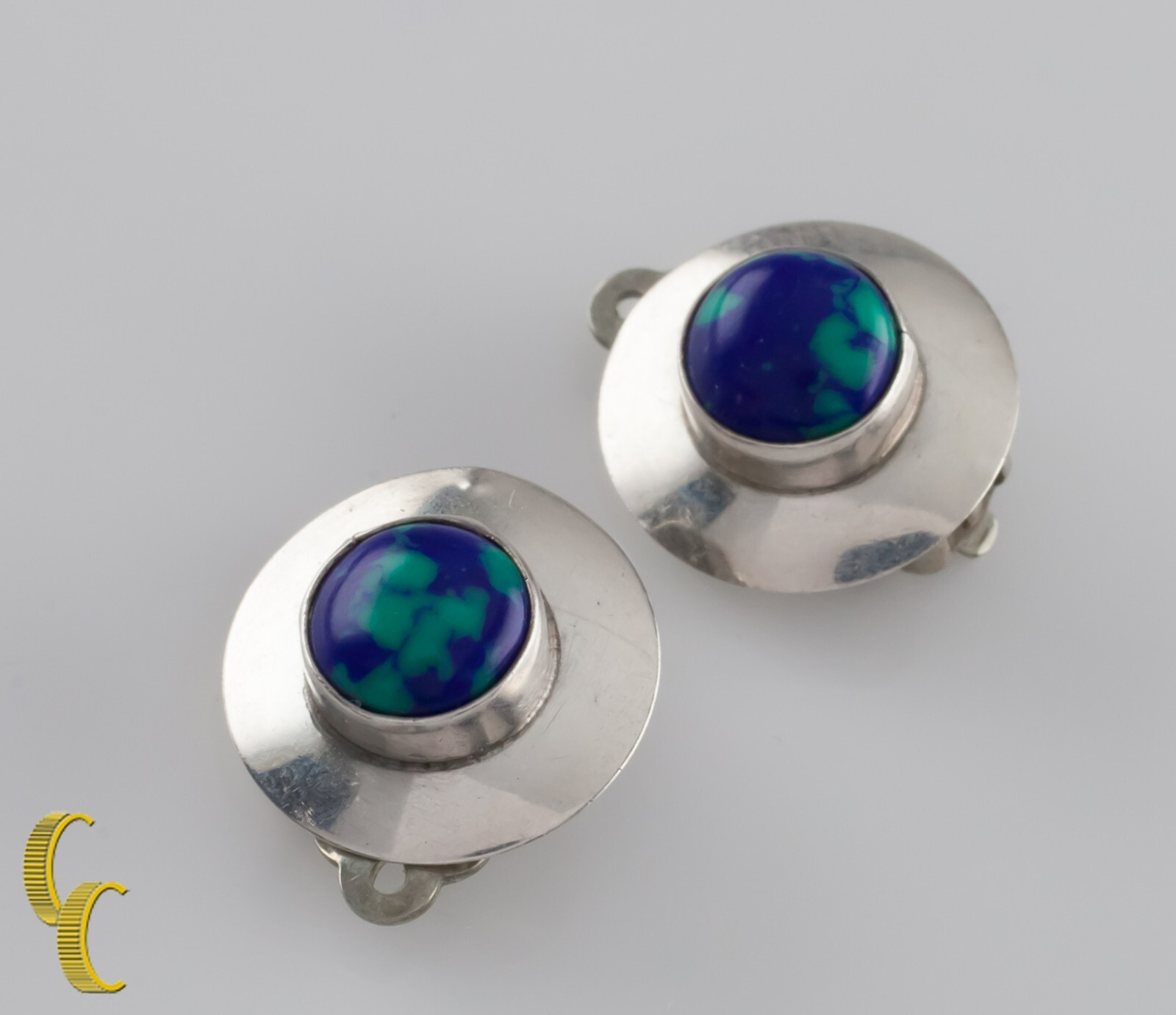 Argent Sterling Malachite Azurite Cabochon avec Clip Earrings IN Disque Réglages