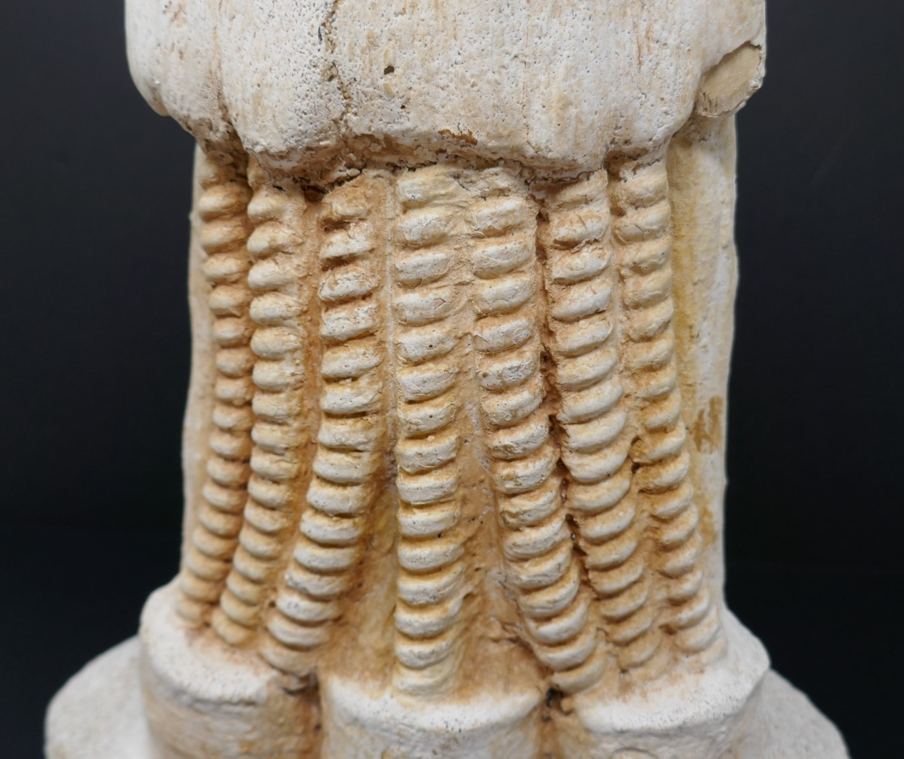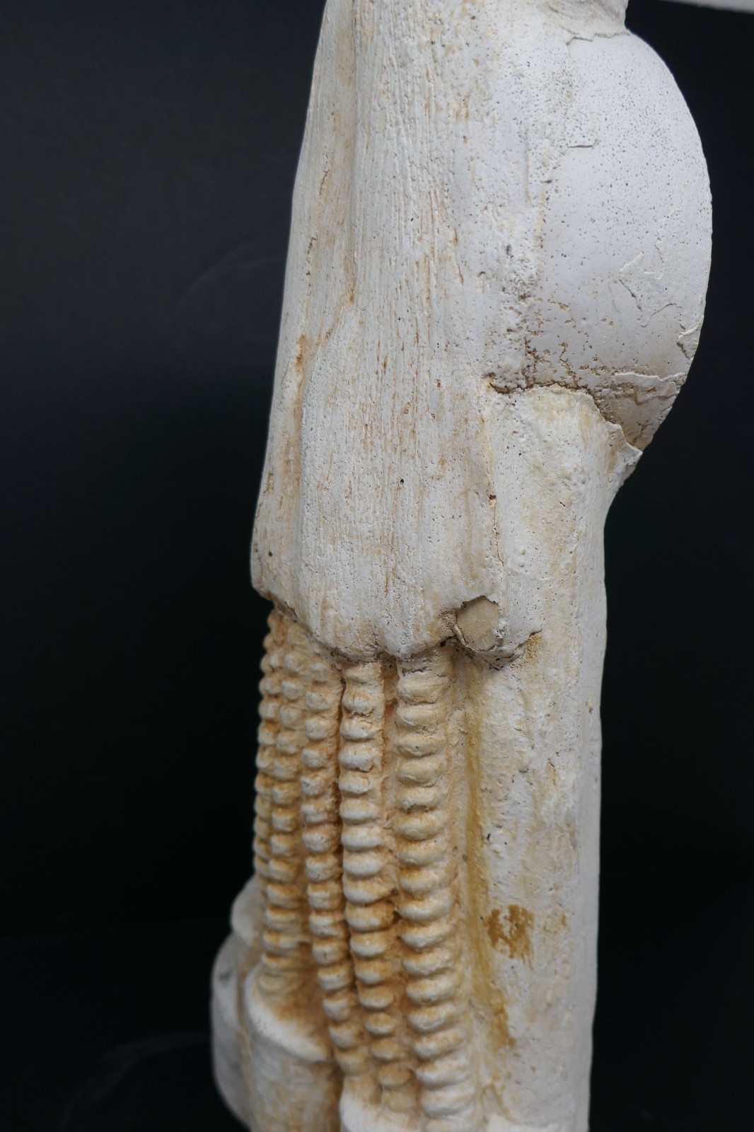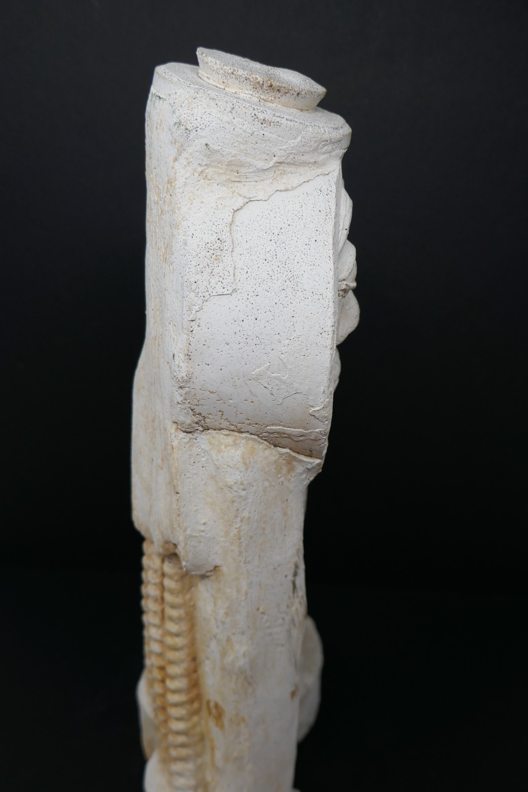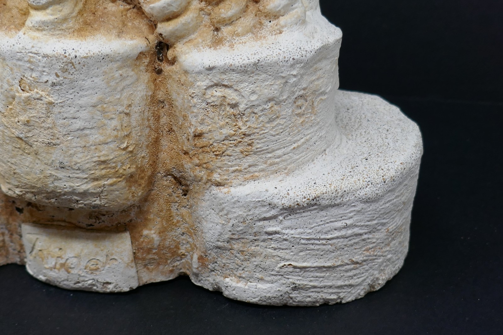 This sculpture features a medium-sized, abstract figure made of heavy stone or cement with braided hair in the back. The artist, possibly named "Rider," has signed the piece, which is off white in color with light brown accents. The sculpture measures 14.5 inches in height and 8 inches wide at the bottom, showcasing a unique and artistic style that would make a striking addition to any art collection.