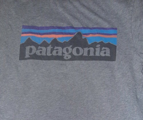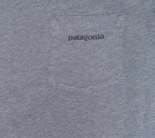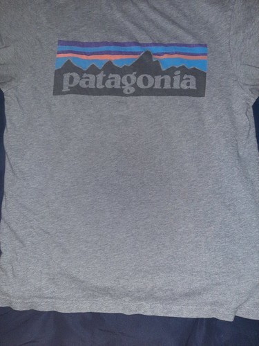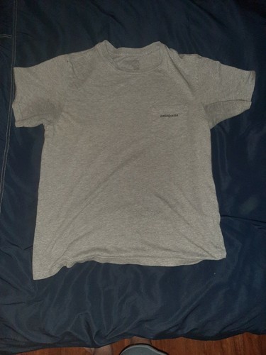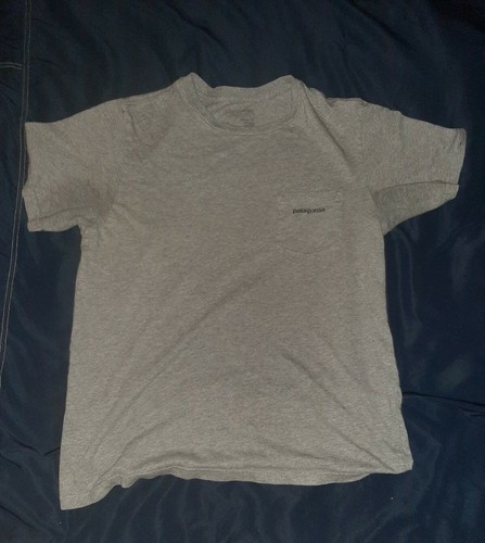 Patagonia P-6 Logo Pocket Tee Mens Gray Organic Cotton T Shirt Made USA. I can't read the size in the label, but according to the Patagonia sizing chart, a Men's Medium is 38-40 and Men's Small is 35-37 chest.