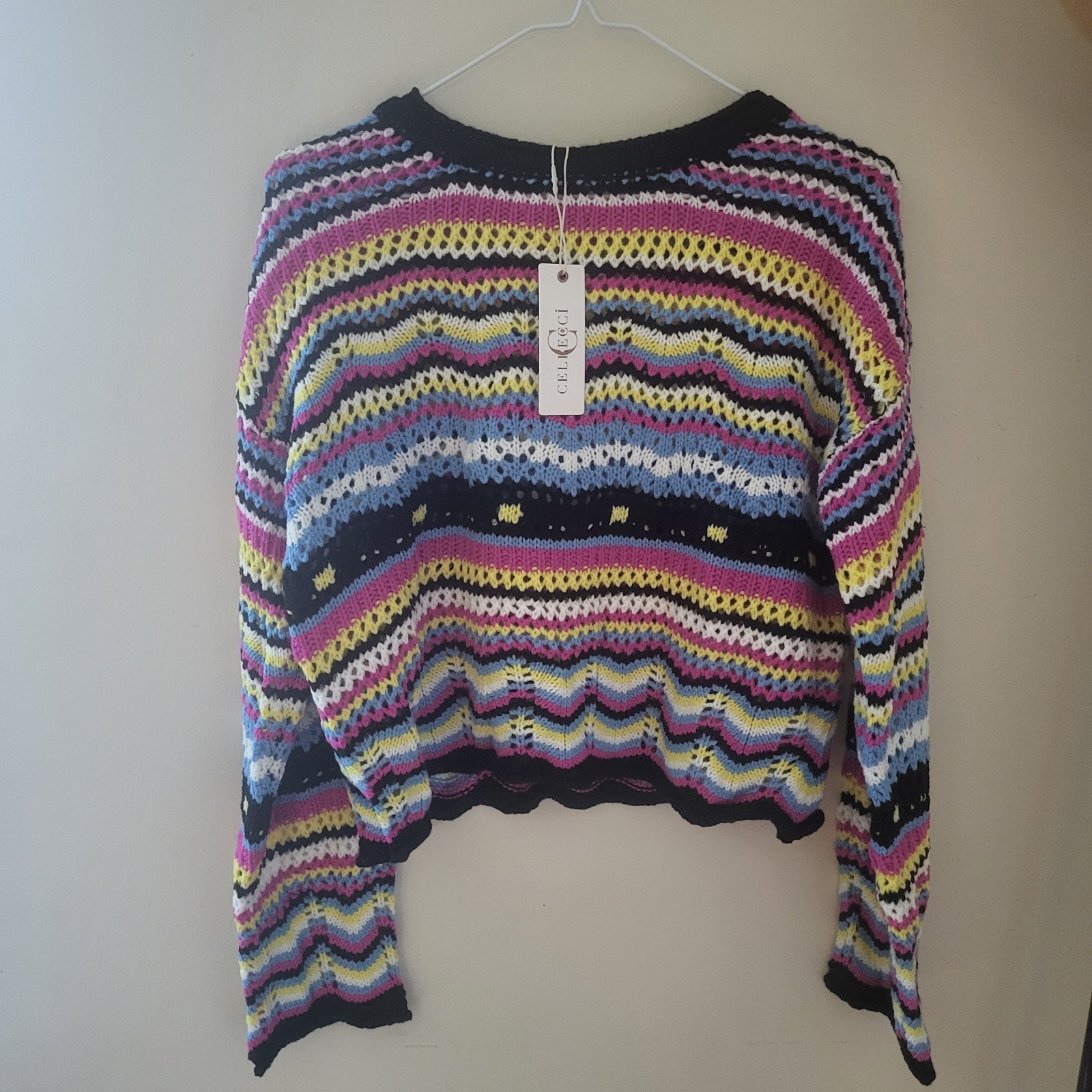 This knitted sweater is super cute! Has a nice mixture of colors. Pit to pit measures approx 23". Length from shoulder to bottom is approx 20" long. 95% cotton 5% spandex