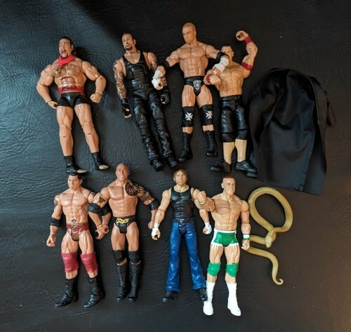 A vendre, il y a beaucoup de 8 figurines de la WWE Mattel a partir de 2011 avec des accessoires. Les personnages incluent John Cena, Rusev, Sting, Triple H, Ambrose et The Rock.