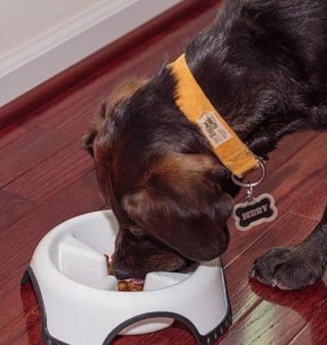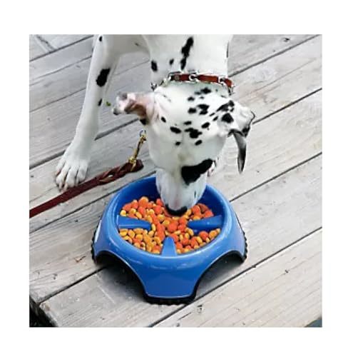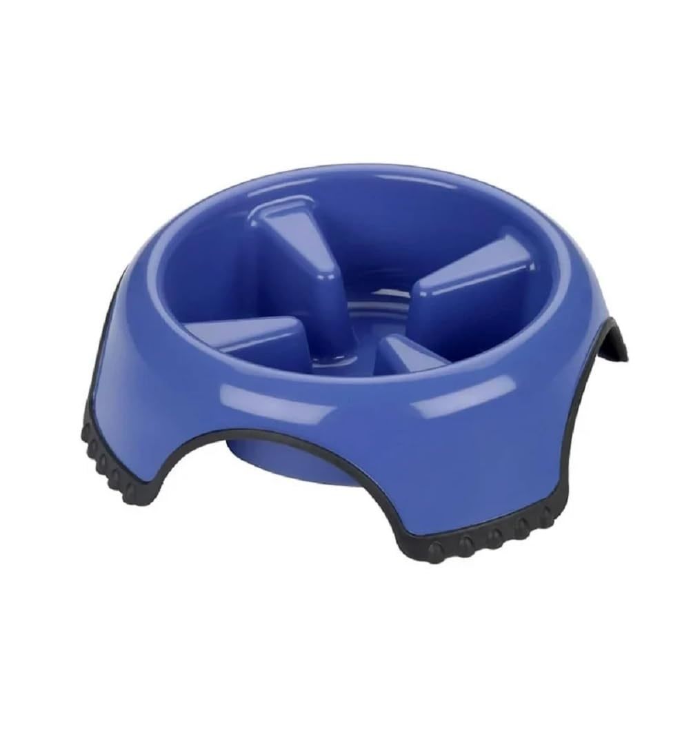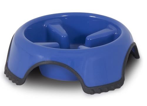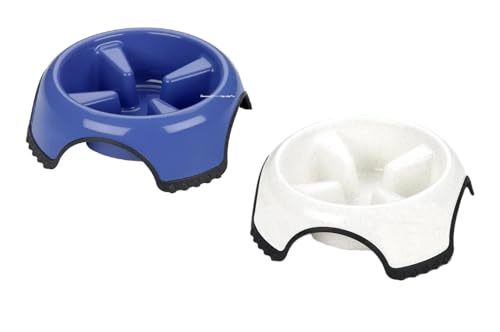 Product description: Skid Stop Slow Feed Bowl is a heavy duty plastic bowl designed to slow rapid eating. Slower eating will promote regular digestion, and prevent bloating and discomfort. Designed with a rubbery base to prevent slippage while pet is eating. Dishwasher safe. Rust resistant. COLORS VARY! Blue and White Available Available Sizes: Medium - 8.5 Inches, Large - 10.5 Inches, Jumbo - 13 Inches