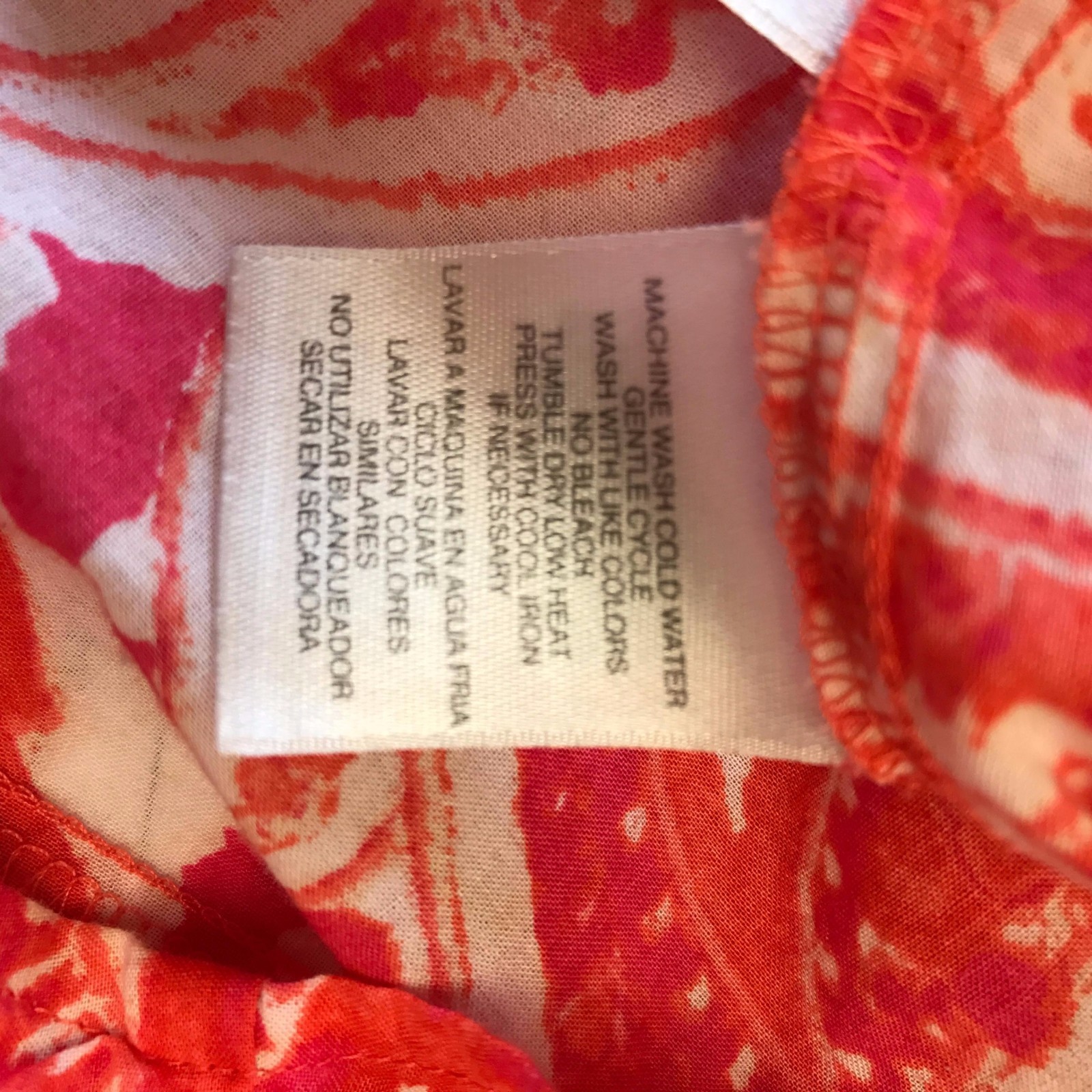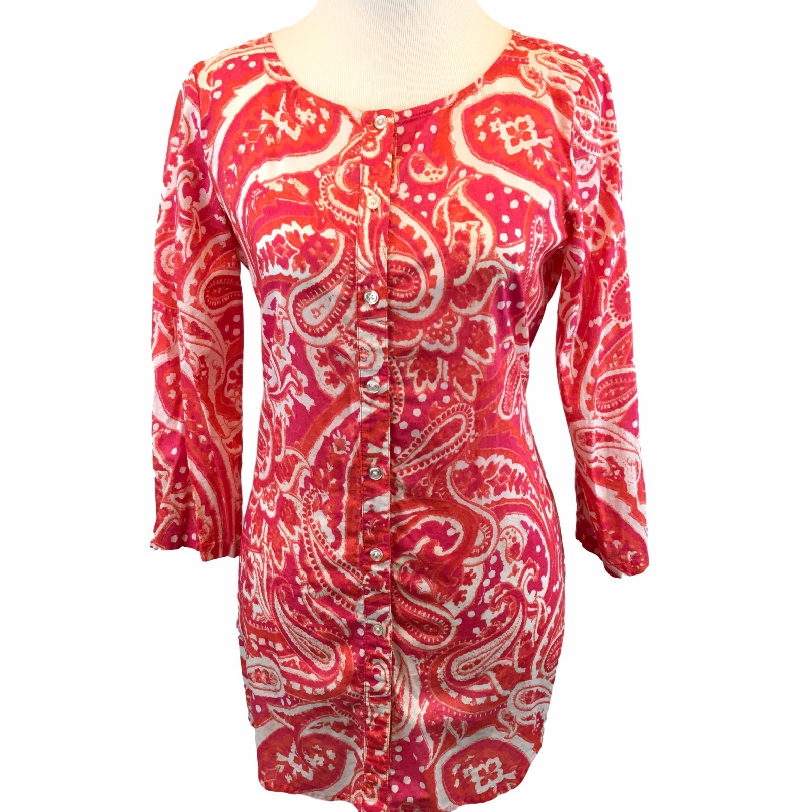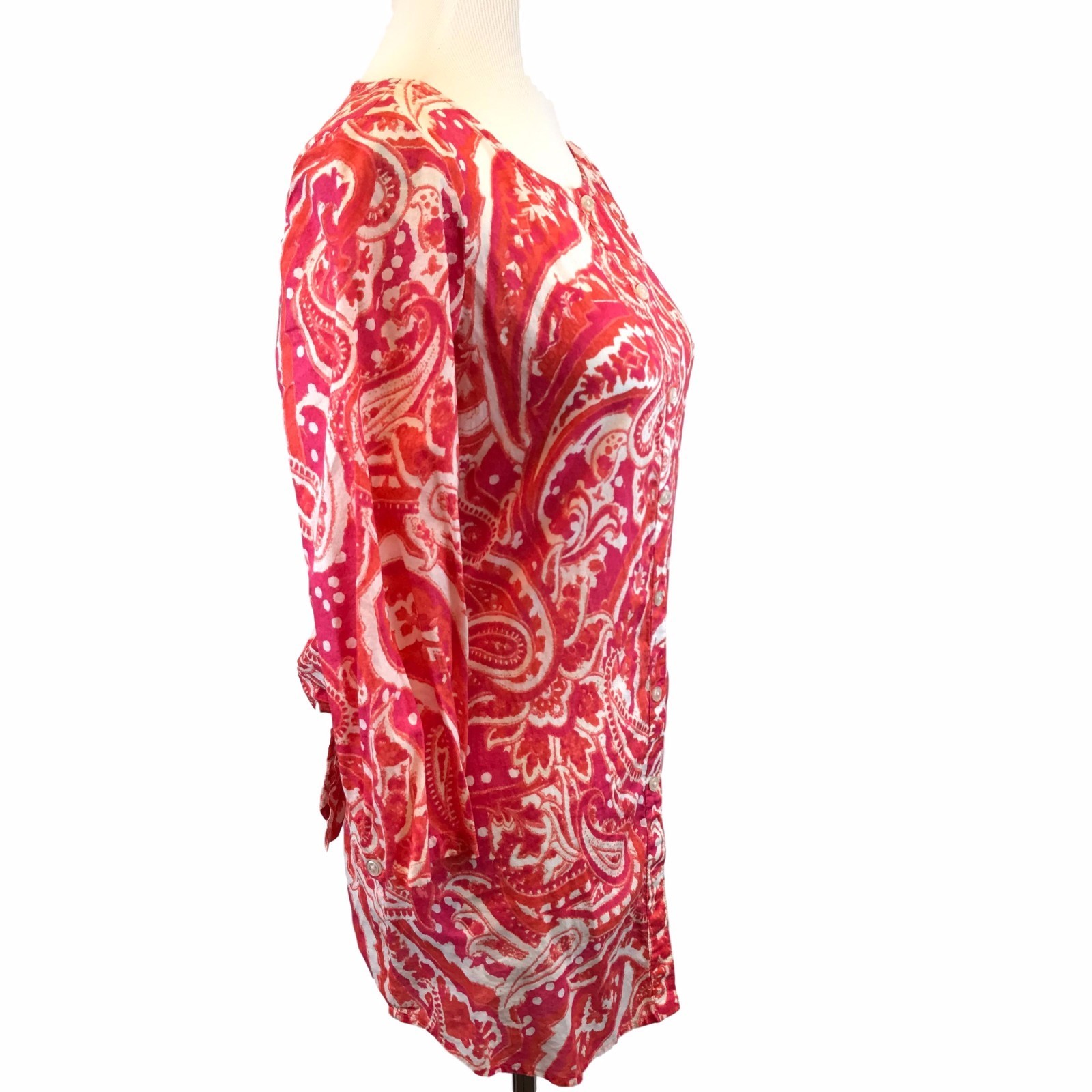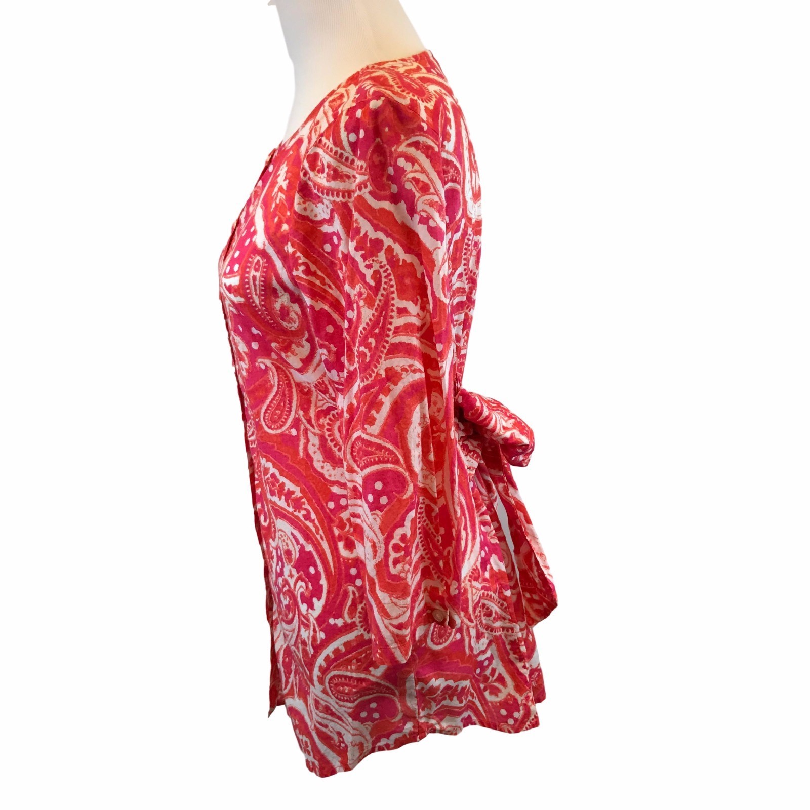 Womens Jones New York button down tunic top shirt with tie waist (can tie in front or back). Three quarter sleeves, fitted top with pink, white, red and orange paisley pattern.