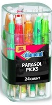 FOR SALE IS ONE (1) NEW CLEAR PLASTIC CANISTER OF 24 PARASOL UMBRELLA PICKS BY DIAMOND BRANDS MPN 16270 UPC # 048789162700. EACH UNIQUE PARASOL PICK MEASURES 3 1/2" TALL WITH 24 count PER SEALED PACKAGE, ASSORTED COLORS OF RED, GREEN, BLUE, YELLOW, MADE OF HIGHEST QUALITY WOOD AND PAPER BY DIAMOND JARDEN. THESE UNIQUE PARTY THEMED PICKS ARE PERFECT FOR HORS D'OEUVRES, APPETIZERS, CHEESE, PARTY PLATTERS OR TABLE DECORATIONS. GREAT FOR YOUR NEXT BEACH PARTY, HAWAIIAN LUAU, TIKI PARTY, PICNIC OR ASIAN THEMED EVENT. STICK THE PICK IN THE COCKTAIL STRAW OR FRUIT GARNISH FOR THE PERFECT DRINK. STICK THE PICK IN THE APPETIZER OR HORS' D'EOUVRES FOR THE PERFECT POLYNESIAN THEMED PARTY PLATTER. THESE ARE THE HIGHEST QUALITY AVAILABLE FROM DIAMOND BRAND, HAND MADE WITH PARCHMENT PAPER AND THEY REALLY OPEN AND CLOSE! COMES IN ATTRACTIVE REUSABLE CLEAR PLASTIC CONTAINER. DIAMOND BRAND MAKES GREAT PRODUCTS LIKE BALL BRAND MASON JARS AND DIAMOND BRAND TOOTHPICKS. YOU WILL RECEIVE THIS ONE (1) FACTORY FRESH SEALED CONTAINER OF 24 PARASOL PICKS MADE BY DIAMOND JARDEN, SHIPPED BY USPS.....
