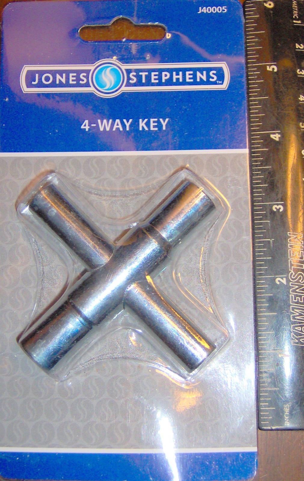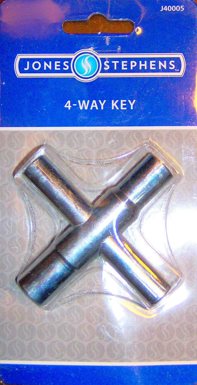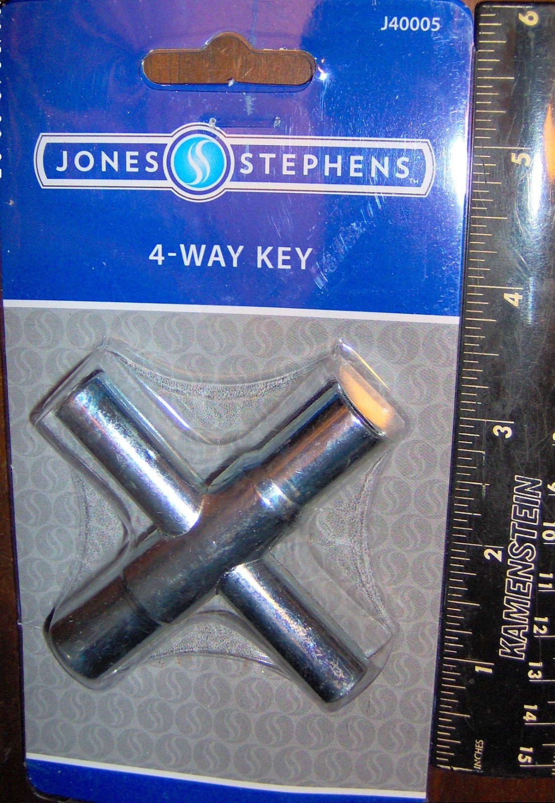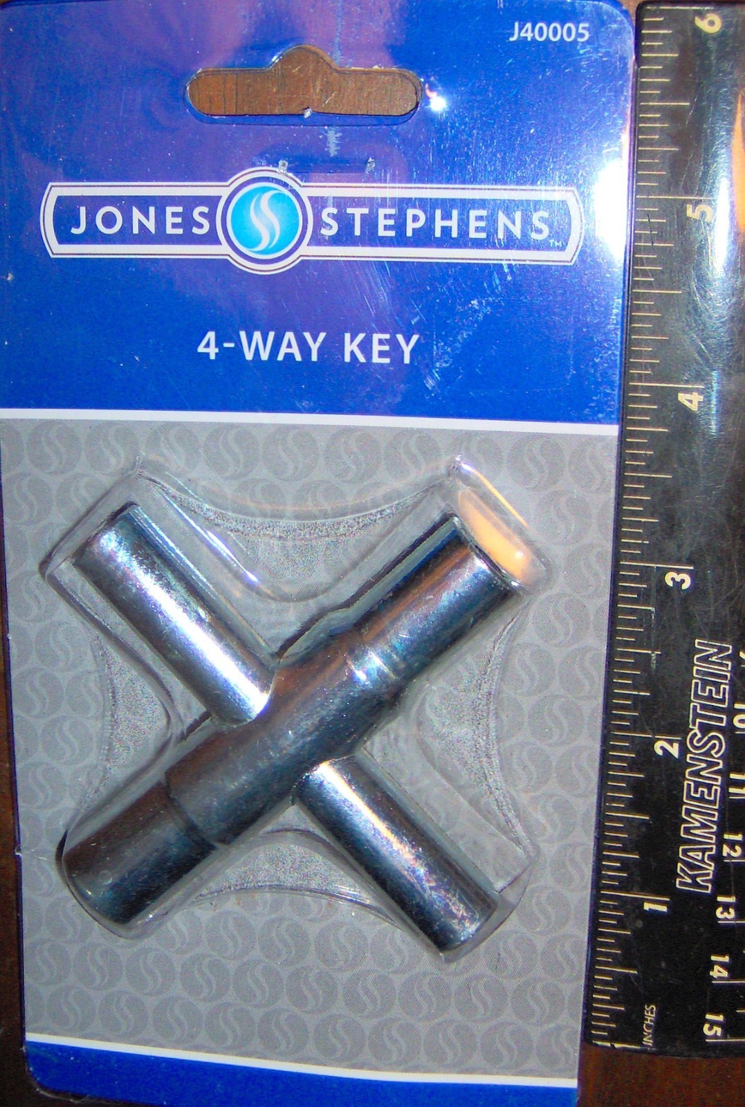 FOR SALE IS ONE (1) NEW 4-WAY STEEL KEY FOR FAUCET, SPIGOT, SILLCOCK, TAP BY JONES STEPHENS CORPORATION MPN J40005 UPC# 717510409055. THIS PLATED STEEL FAUCET KEY WITH FOUR (4) DIFFERENT SIZES IS USED TO OPEN (or close) SPIGOTS, FAUCETS, VALVES, SILLCOCKS OR TAPS REQUIRING A SQUARE KEY. OUTDOOR SPIGOTS AND SOME INDOOR SPIGOTS OFTEN REQUIRE AN ACCESS CONTROL KEY, IRRIGATION SYSTEMS, POOL SPIGOTS, BASEMENT SPIGOTS, ESPECIALLY IN A COMMERCIAL ENVIRONMENT MAY REQUIRE A FAUCET KEY OR SPIGOT KEY TO TURN THE WATER ON AND OFF. THIS 4-WAY KEY WILL USUALLY GET THE JOB DONE SINCE IT HAS FOUR (4) DIFFERENT SIZES, 1/4", 9/32", 5/16", 11/32". PLEASE DO YOUR RESEARCH TO DETERMINE COMPATIBILITY SINCE THERE ARE SEVERAL SIZES OF FAUCET KEYS, THESE ARE THE MORE POPULAR SIZES ON THIS QUALITY 4-WAY KEY BY JONES STEPHENS BRAND. THIS SALE IS FOR ONE (1) 4-WAY KEY BY JONES STEPHENS BRAND. YOU WILL RECEIVE ONE (1) PLATED STEEL 4-WAY KEY BY JONES STEPHENS BRAND SHIPPED BY USPS FIRST CLASS MAIL.....