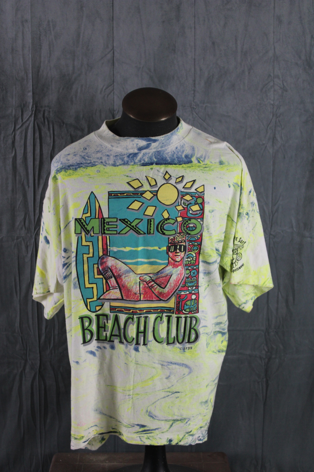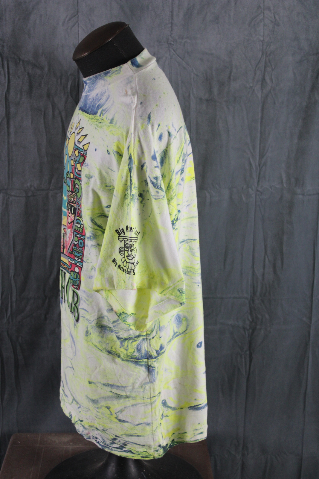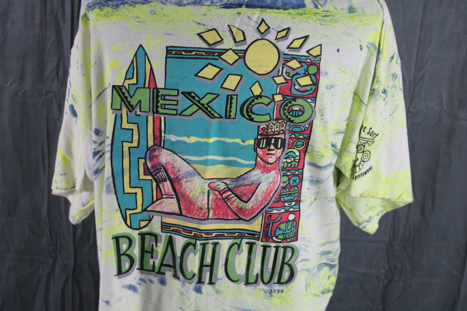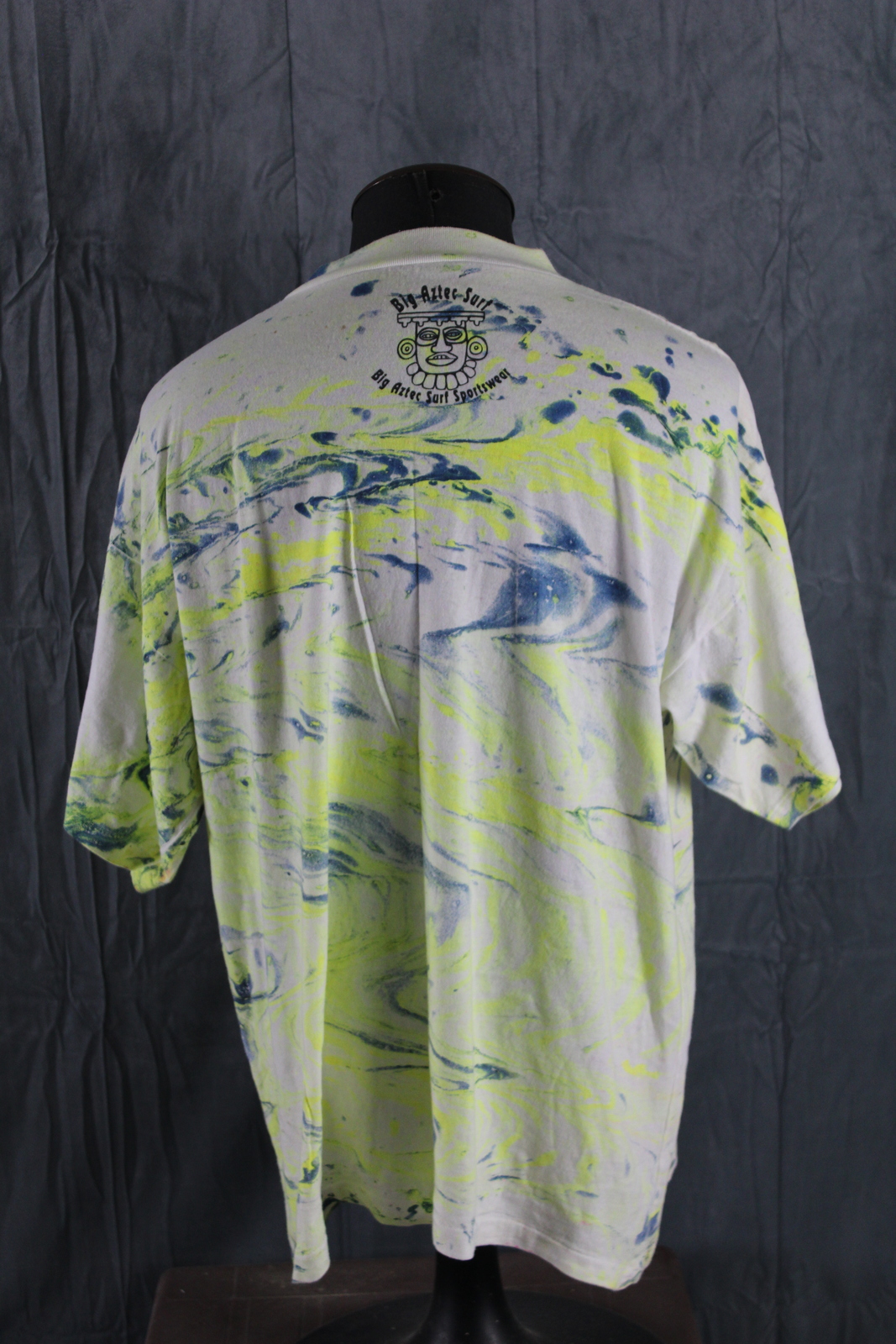 UP for sale is a vintage graphic t-shirt. It has a yellow and blue tie-dye base pattern. The front of the shirt has a lrage graphic of a cartoon sufer screened on with Mexico above. The left sleeve and back neck of the shirt have the Big Azter Surf logo screened on in black. What a great vintage shirt do not miss out on it.
