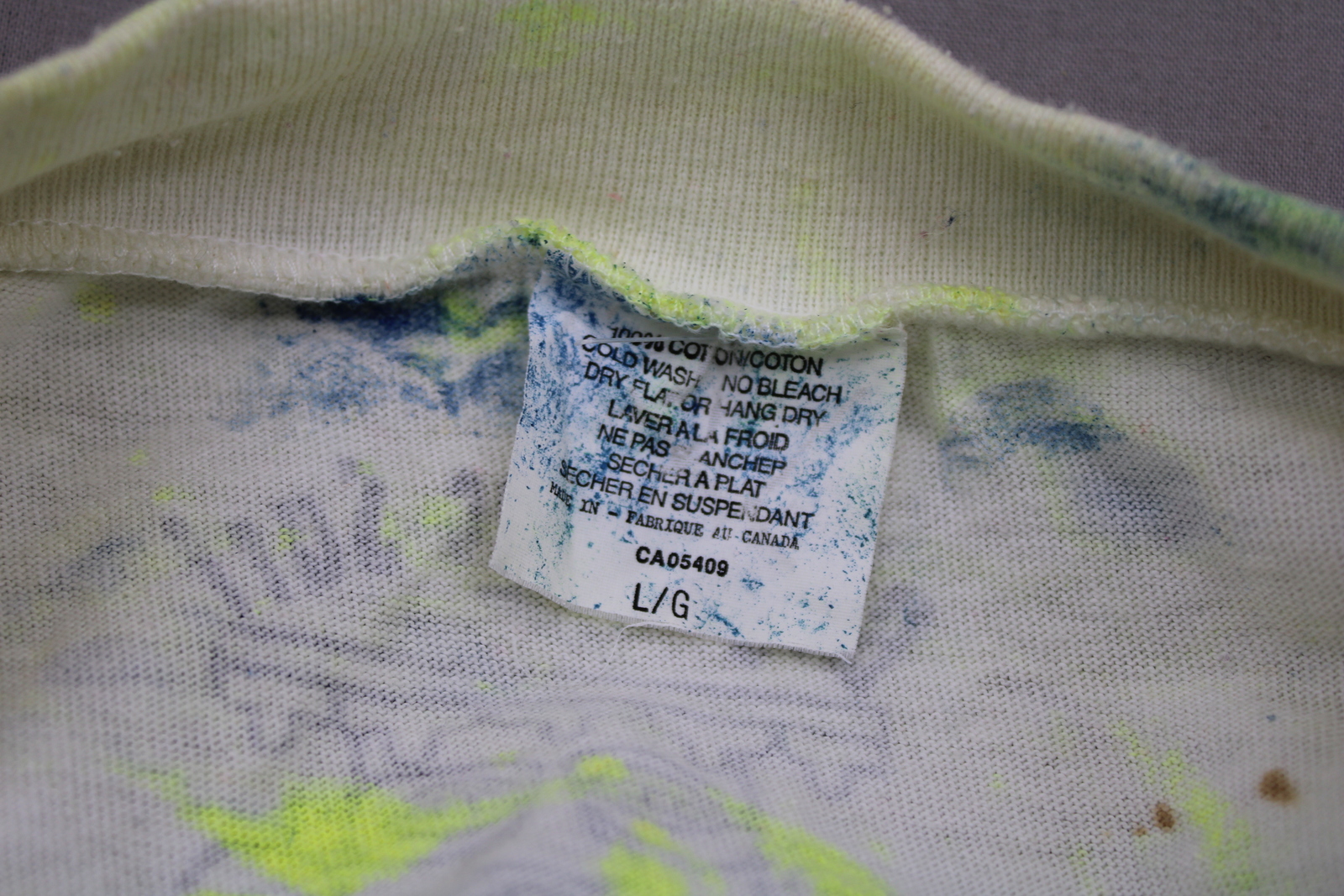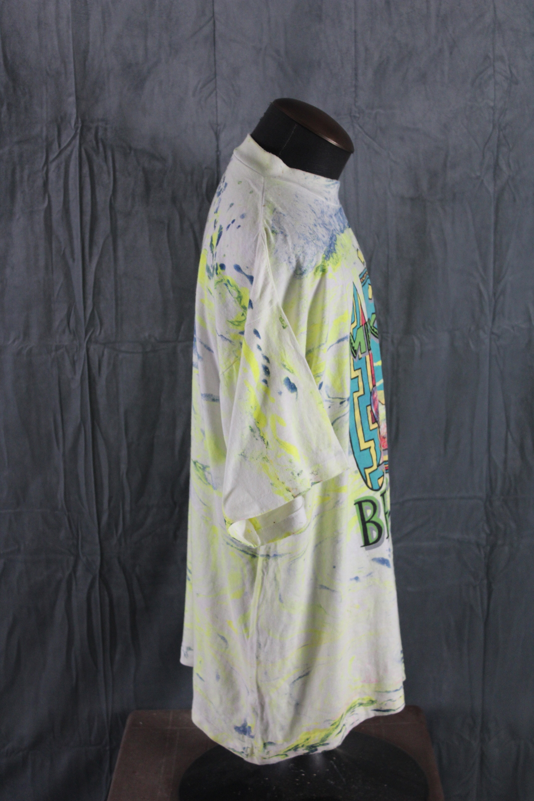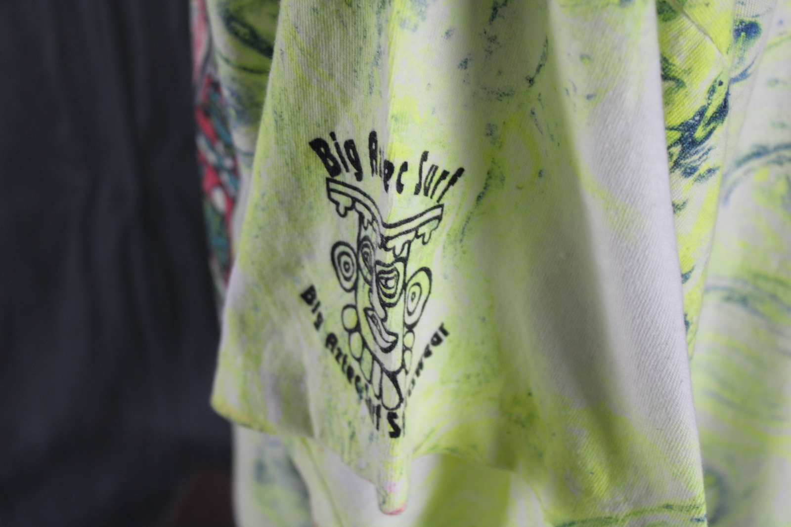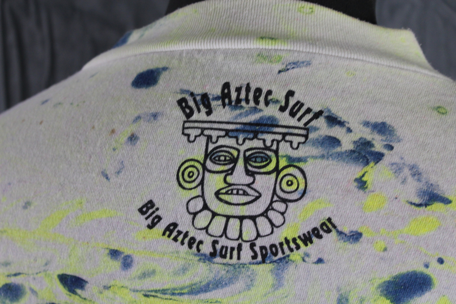 UP for sale is a vintage graphic t-shirt. It has a yellow and blue tie-dye base pattern. The front of the shirt has a lrage graphic of a cartoon sufer screened on with Mexico above. The left sleeve and back neck of the shirt have the Big Azter Surf logo screened on in black. What a great vintage shirt do not miss out on it.