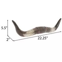 The grit and charm of nature meet in this pair of commanding horns! Longhorn Western Wall Decor is made of resin and is shaped like two horns connected at the center by a section that mimics an ornate leather strap. This resin center is embossed with a floral and flourish design, adding to the horns' country charm. Hang this southwestern beauty in the living room of your ranch house as a rustic statement!
