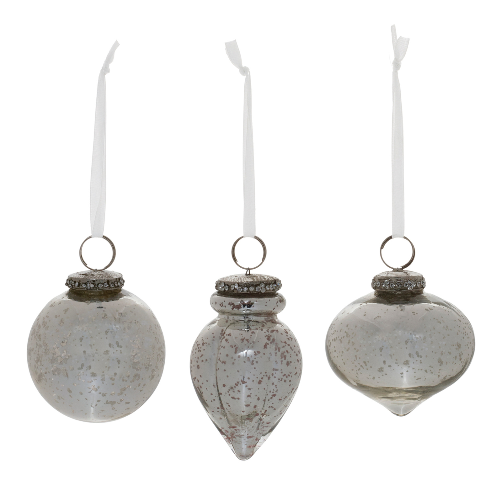 Elevate your holiday decor with this exquisite Set of Silver Mercury Glass Ornaments. Featuring a sophisticated blend of deep gray and silver tones, these ornaments showcase timeless shapes that bring elegance to your Christmas tree. Crafted from high-quality mercury glass with a rustic brass hanger, these ornaments offer a vintage-inspired charm that lasts for seasons to come. Whether adorning your own tree or given as a thoughtful holiday gift, this set adds a touch of classic beauty and festive spirit to any home. Sold in a collection of six pieces with three assorted designs to create a balanced display on your Christmas tree.