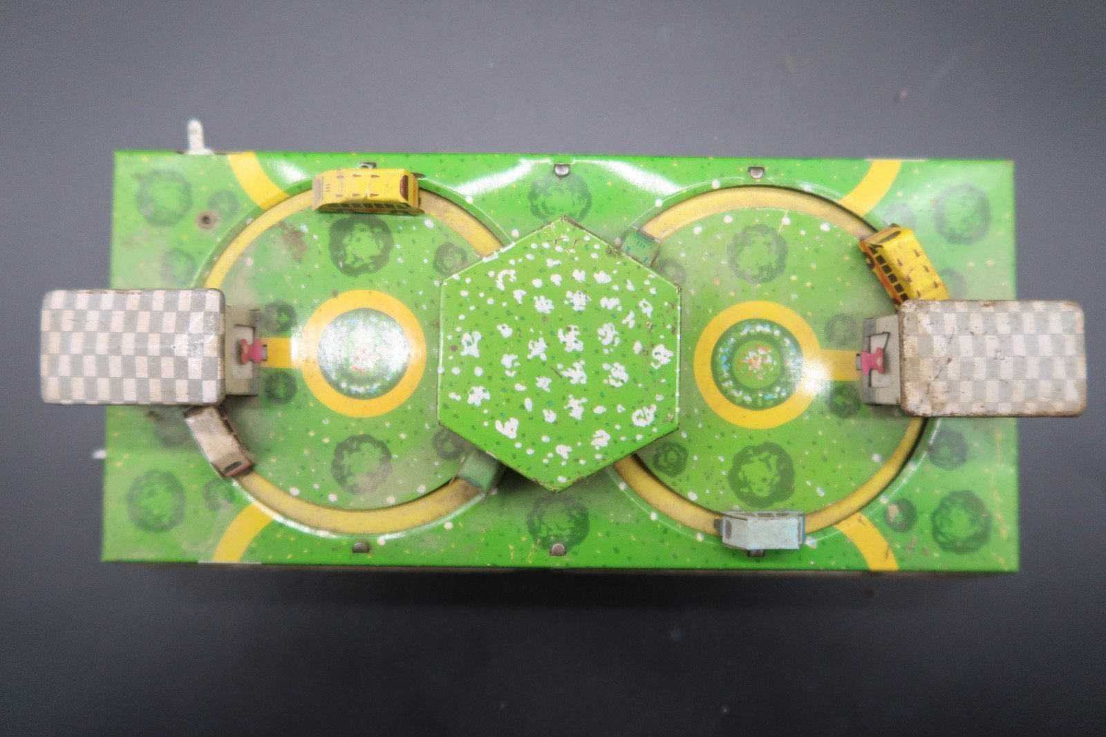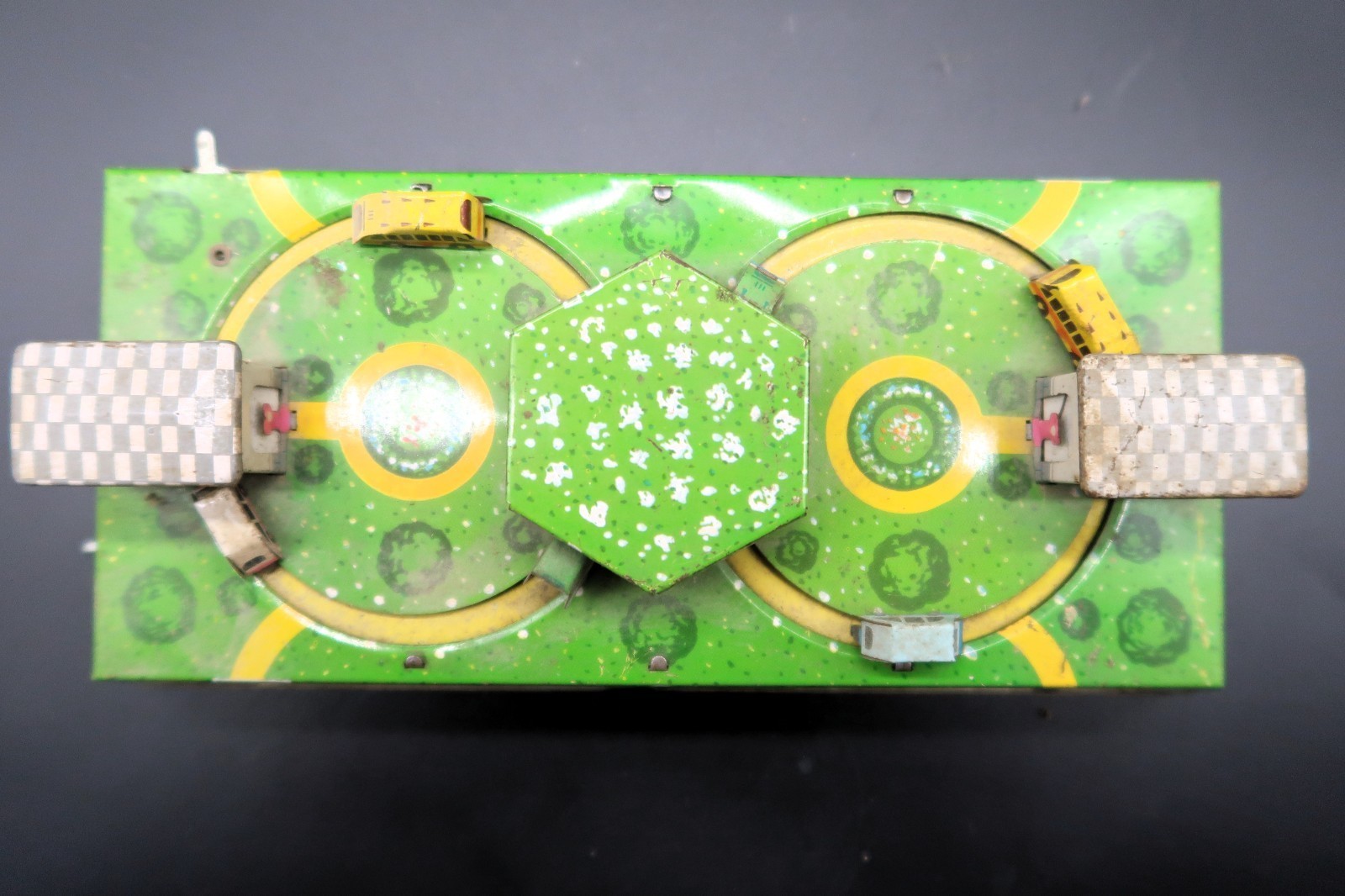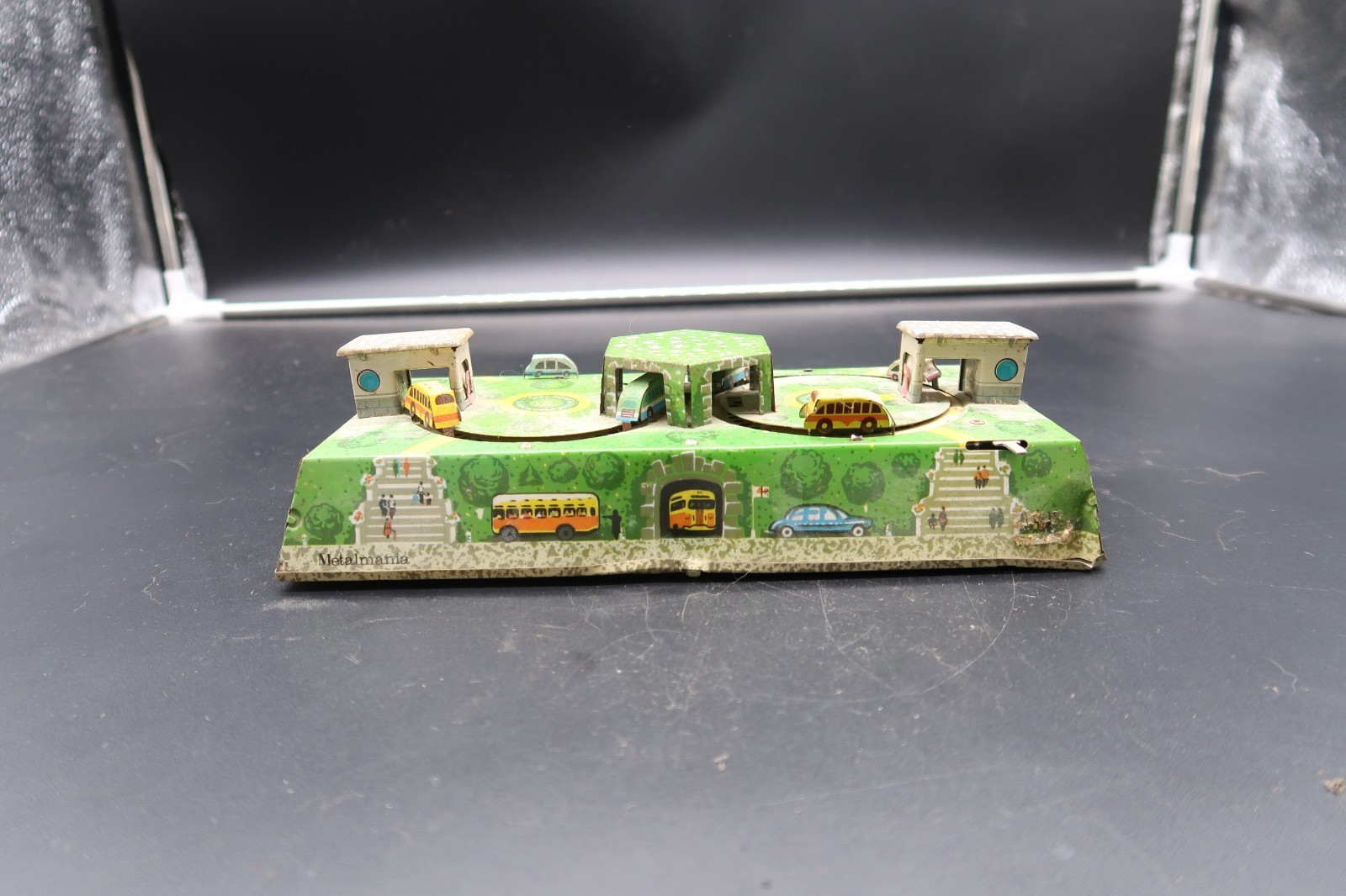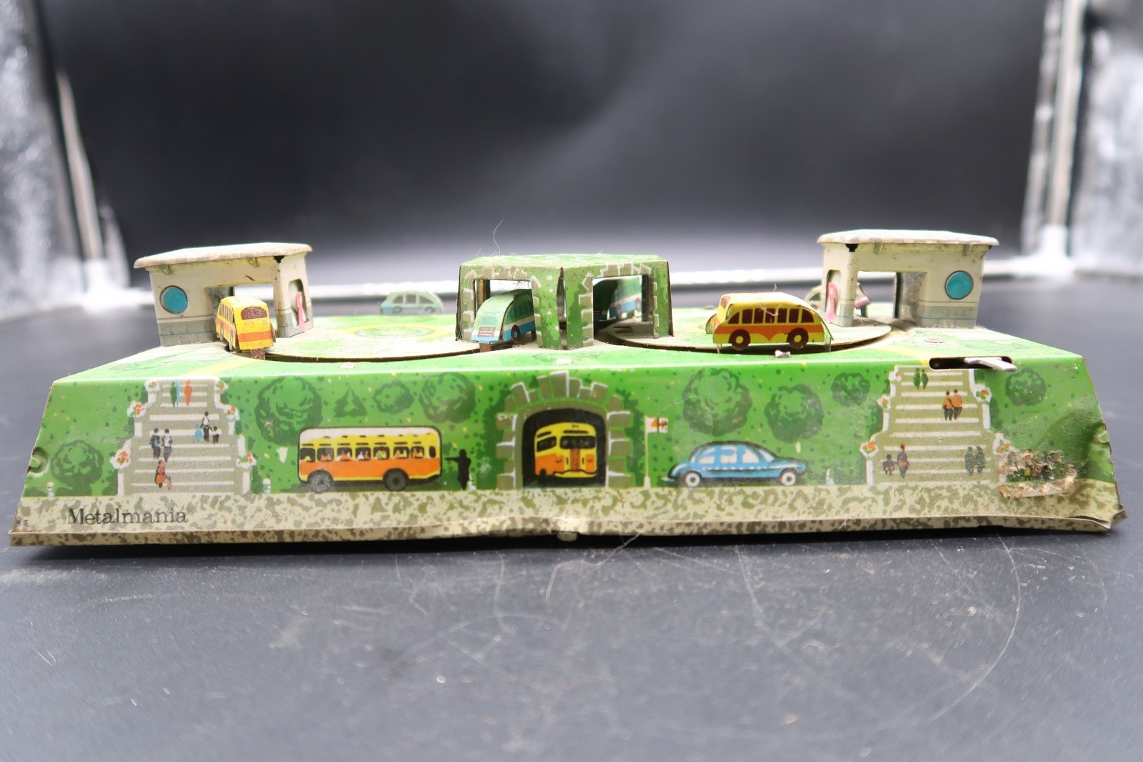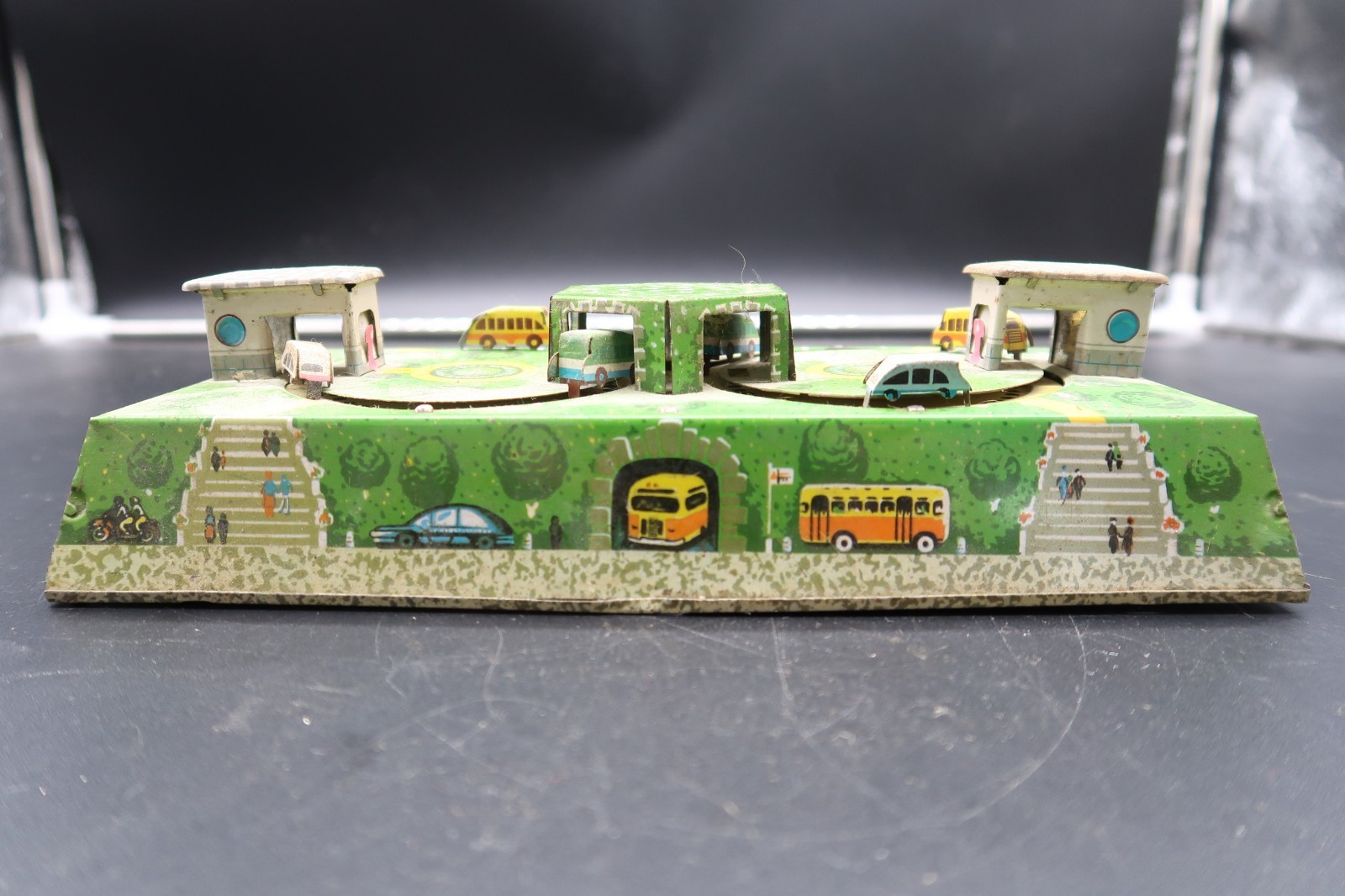 Vtg Tin Litho Windup Toy Cars Buses Double Roundabout w/ Tunnel