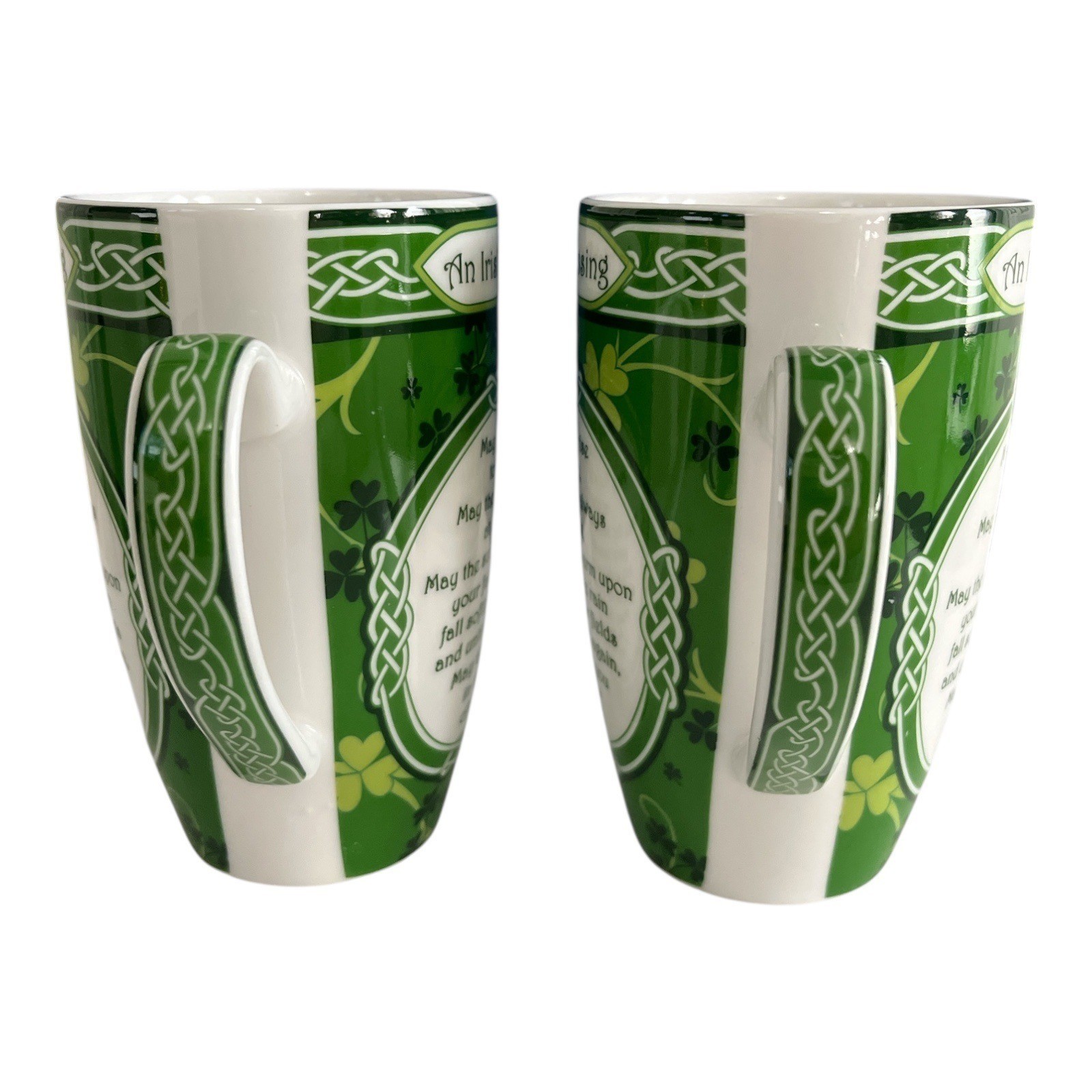 Pair of matching ?An Irish Blessing? mugs from the Shamrock Garden collection by Clara. Each features a bright green Celtic knot and shamrock pattern with the traditional Irish Blessing poem. Made of new bone china and designed for both beauty and function, these mugs capture classic Irish charm and are perfect for daily use or display.