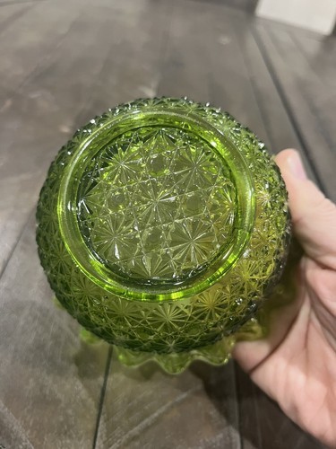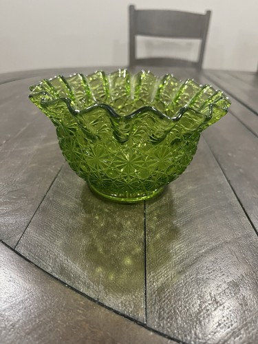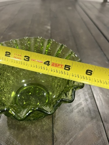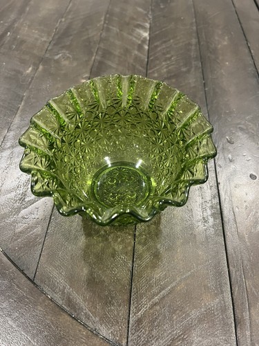 This vintage L.E. Smith bowl features a daisy and button pattern in a charming avocado green color. The bowl has a round shape with a crimped ruffled edge, measuring 6 inches in diameter and 3 inches in height. Handmade in the United States, this mid-century modern style bowl is made of pressed glass and serves as a decorative piece for any home.