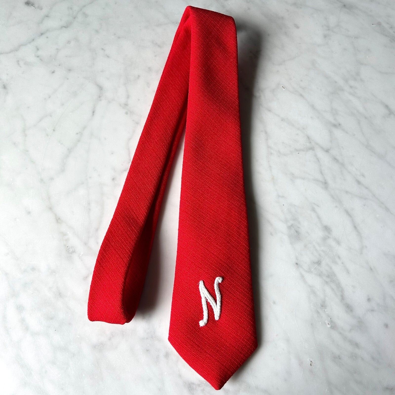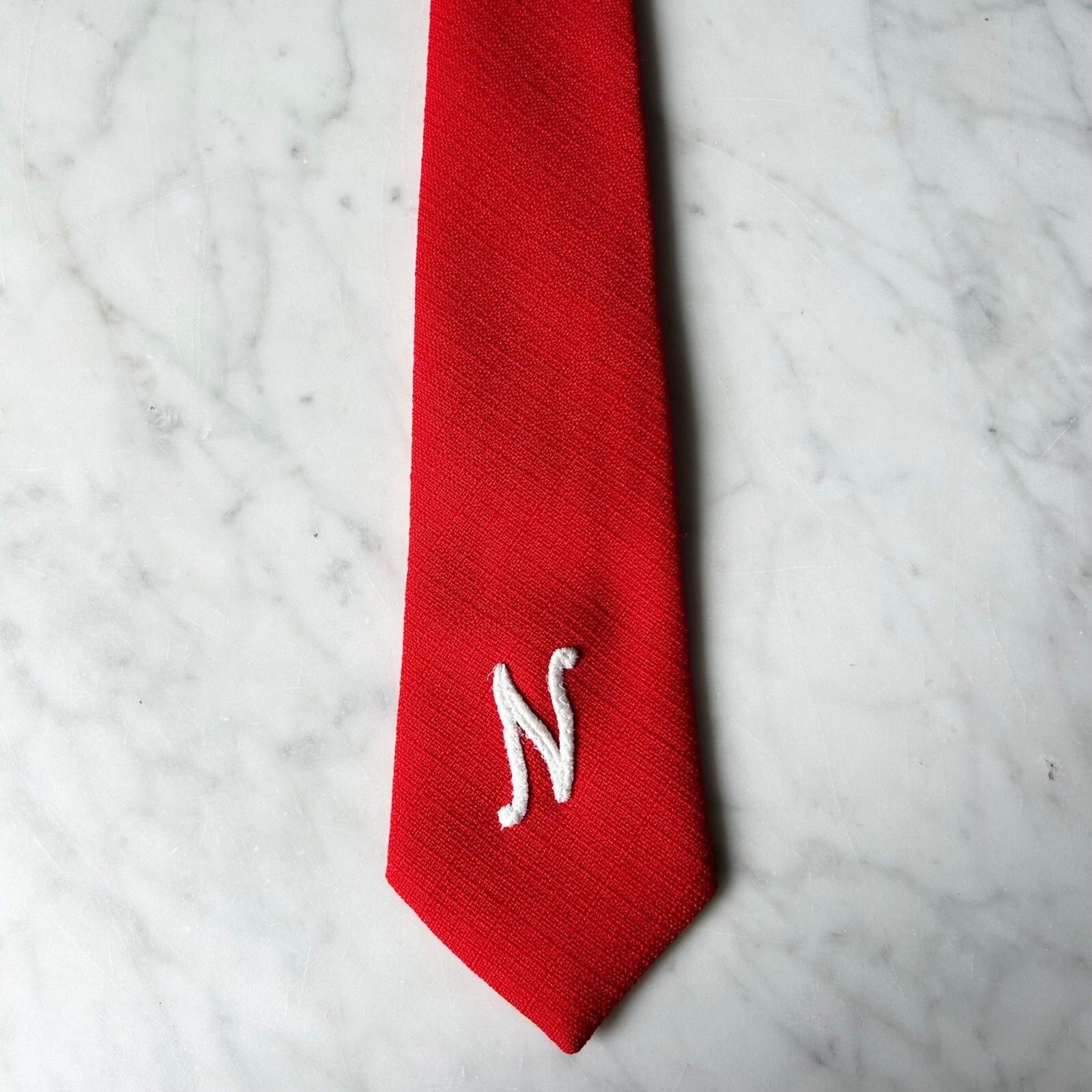 Vintage Nebraska Cornhusker neck tie is red textured polyester with a white embroidered N. Perfect for your favorite Husker football or volleyball sports fan. Story Cravats, Pride of the Midwest. 59" long, 3-1/8" wide.