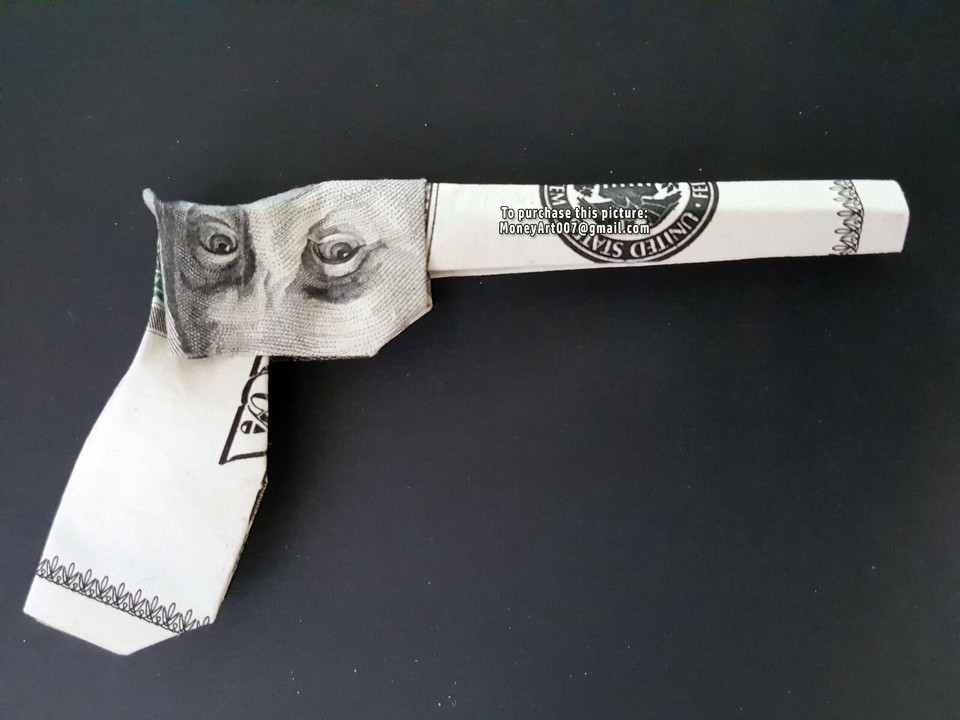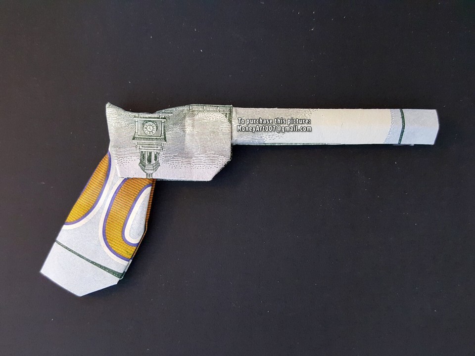 Up for sale is a beautifully crafted Origami Gun. It's folded by hand and it's made with real money!