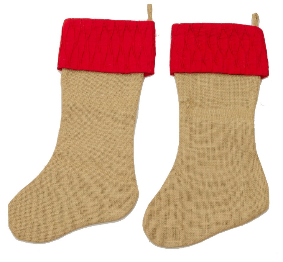 These festive Christmas stockings are just waiting for a visit from Santa! The stockings are natural color jute with red cotton pintuck top in a diamond pattern. Use these simple but beautiful stockings on your fireplace mantle on their own or with the matching Christmas tree skirt. Reversible left or right sided.