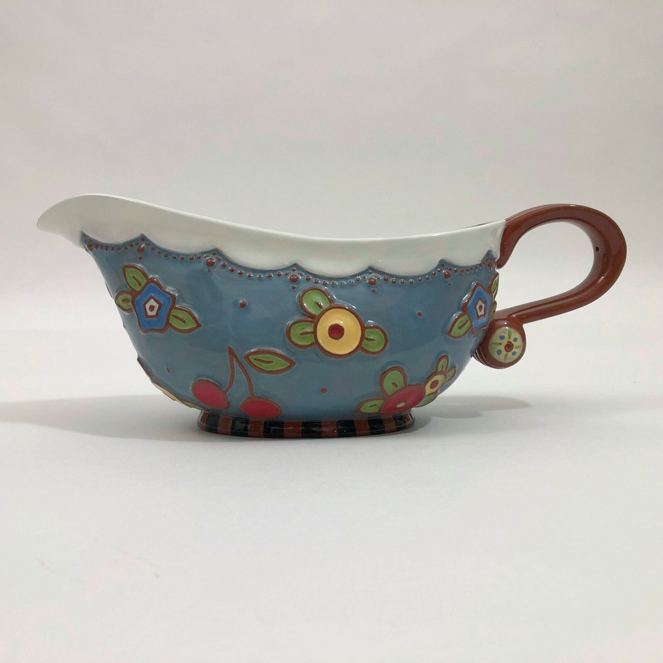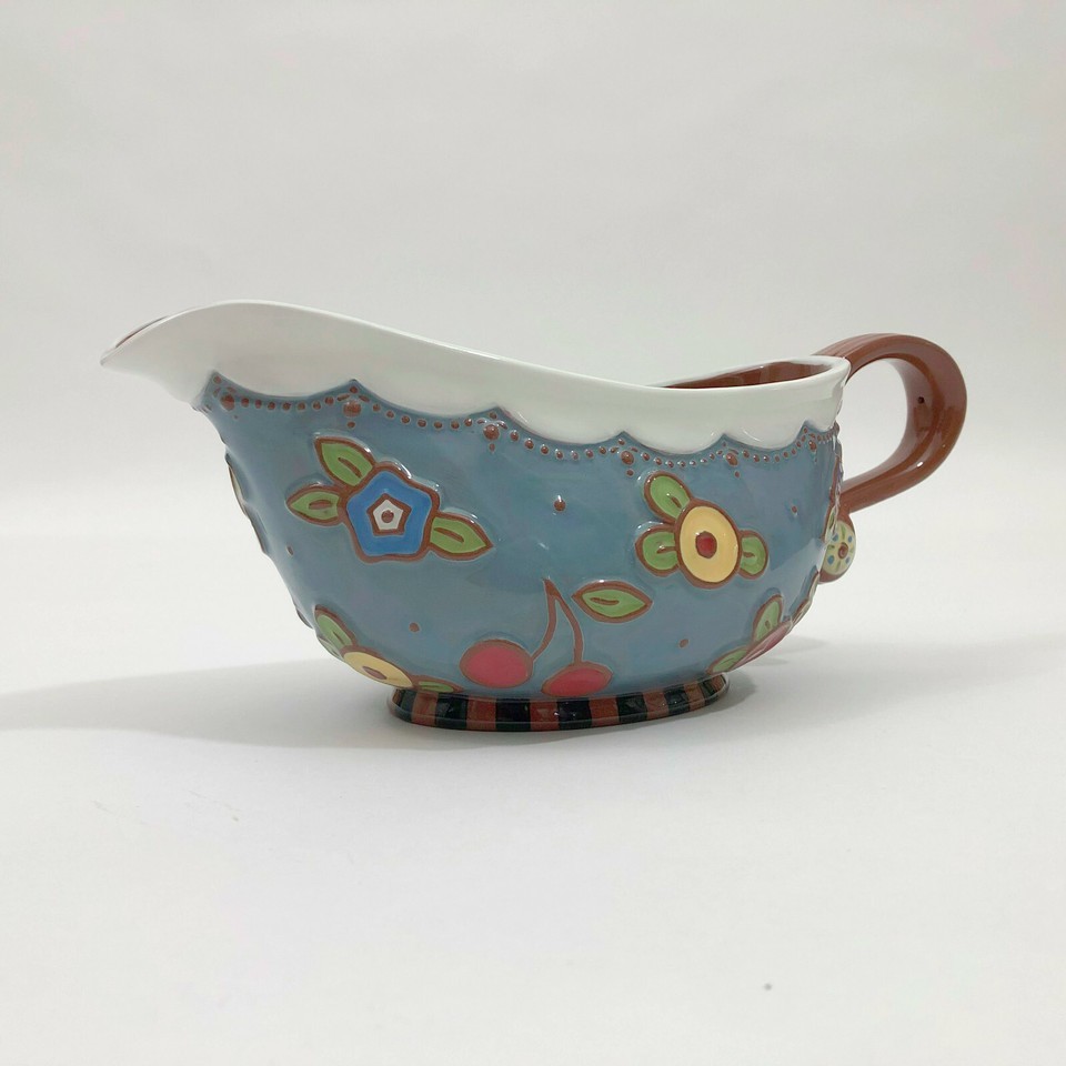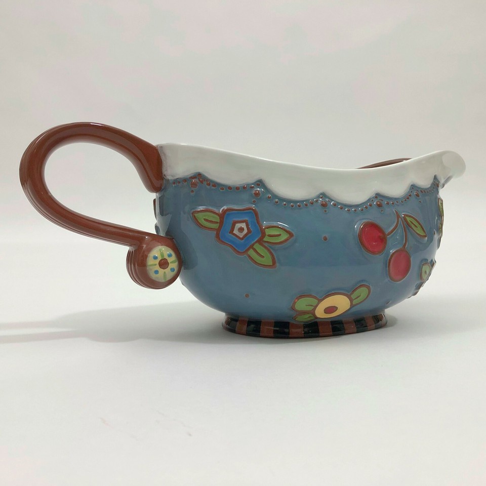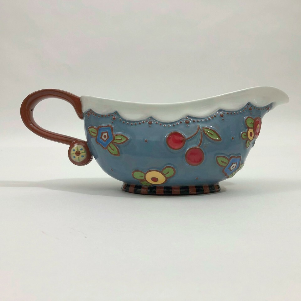 EUC, Excellent Used Condition. This Mary Engelbreit gravy boat is in excellent condition. It has a beautiful shade of gray blue body accented with a white scalloped border at the top. There are pretty red cherries and flowers in blue yellow. The handle is brown as is the interior. And the base is brown black stripe. Add a pop of fun to your table with this unique gravy boat. No cracks, chips or crazing.