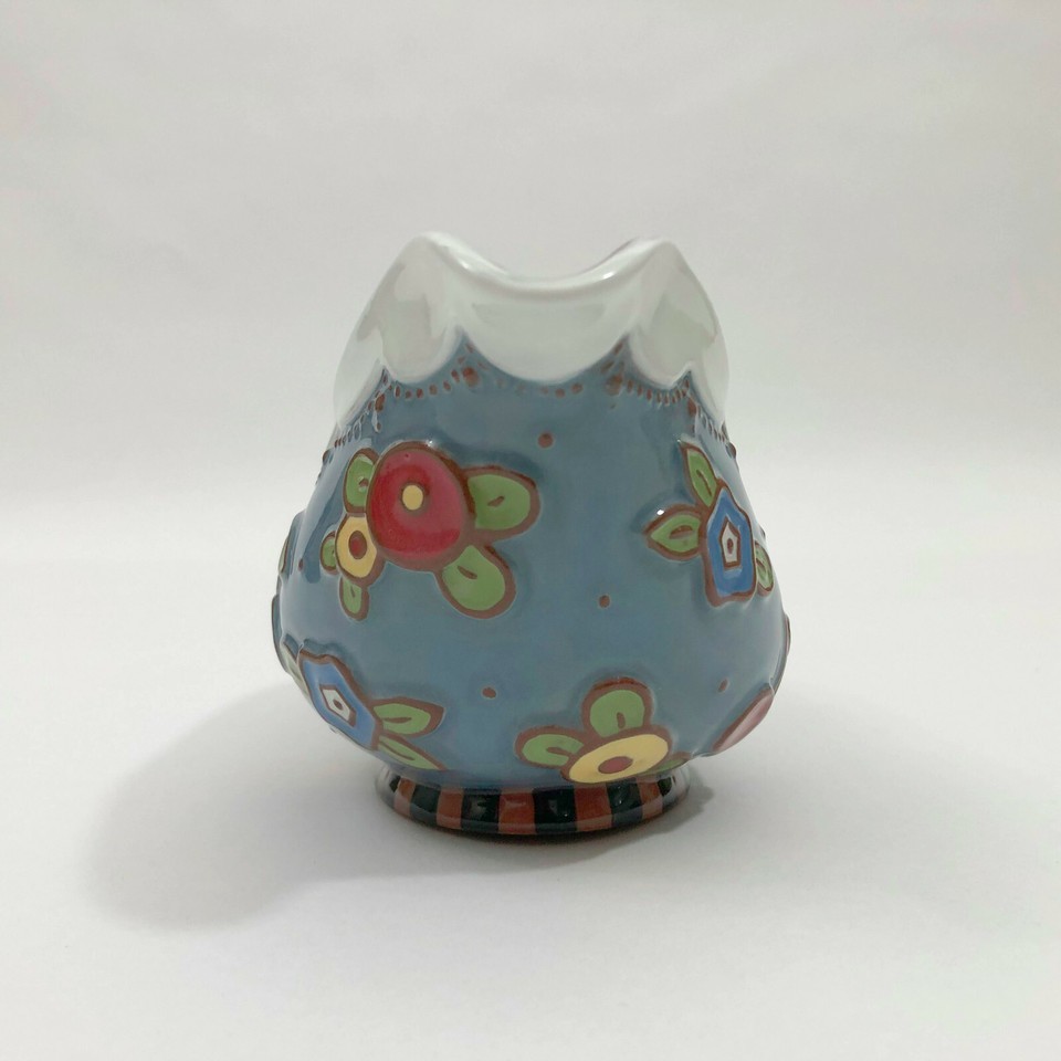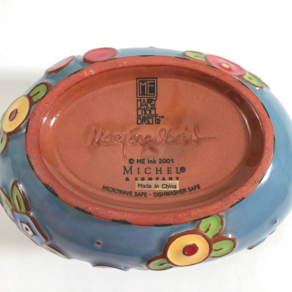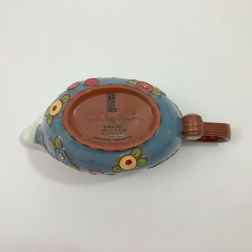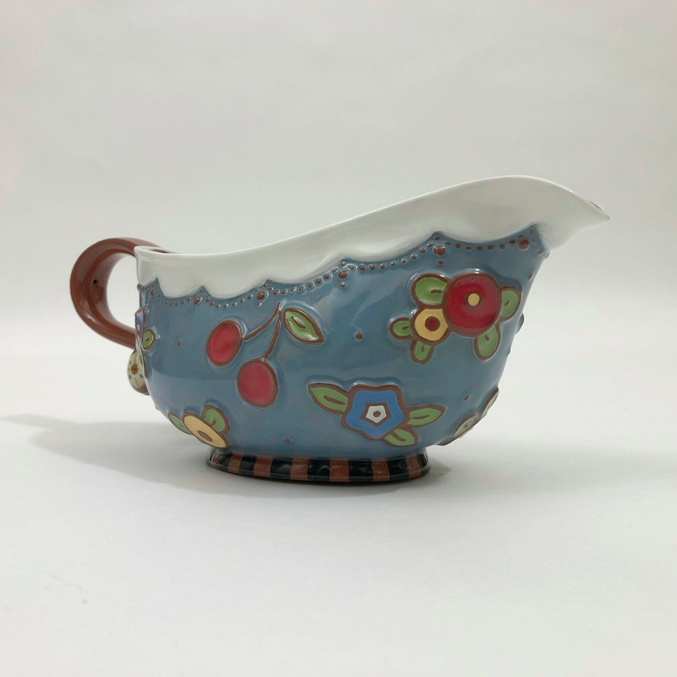 EUC, Excellent Used Condition. This Mary Engelbreit gravy boat is in excellent condition. It has a beautiful shade of gray blue body accented with a white scalloped border at the top. There are pretty red cherries and flowers in blue yellow. The handle is brown as is the interior. And the base is brown black stripe. Add a pop of fun to your table with this unique gravy boat. No cracks, chips or crazing.