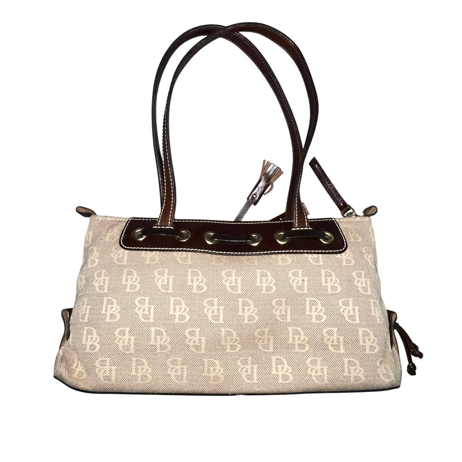 Authentic vintage Dooney Bourke shoulder tote, style HP73Q, variation Y8, from the Monogram Collection. Crafted from durable beige canvas featuring the signature ?DB? logo print and rich brown leather trim, this timeless design features double leather straps, gold-tone grommet detailing, and tassel accents.