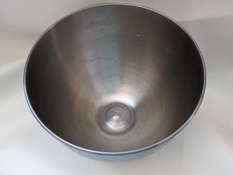 Zum Verkauf steht ein gebrauchter echtes Kitchenaid Edelstahl K45 Mixing Bowl Ersatz -Original mit einem Durchmesser von 8,5 Zoll.