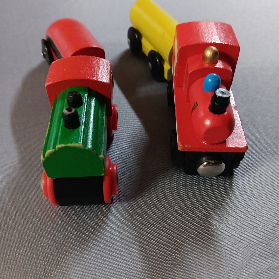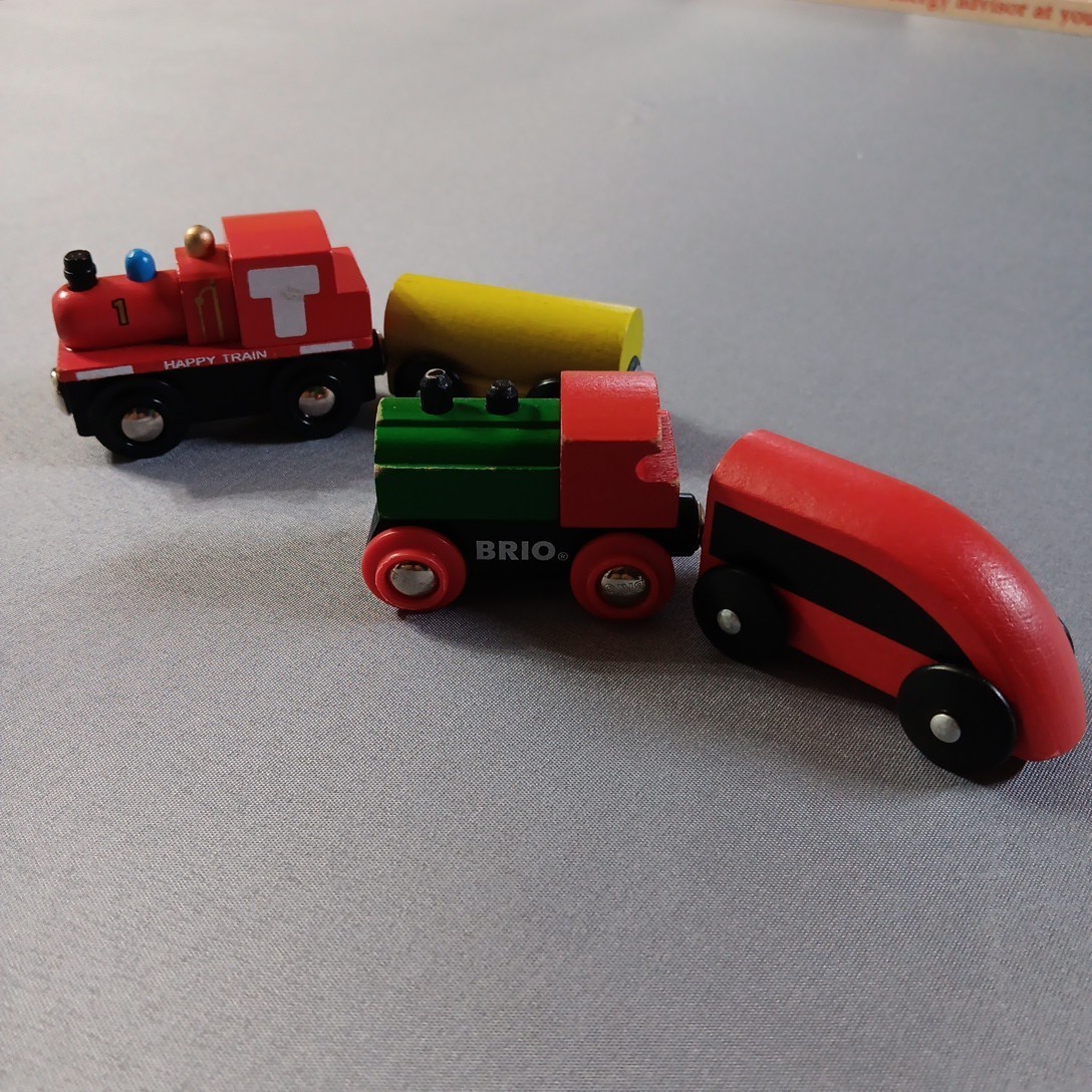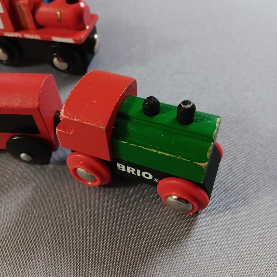 This product is a mixed lot of BRIO wooden train from the 1990s, featuring a green, red, and black classic engine along with some unmarked cars and engine. Designed for children aged 3-7, this toy set offers hours of imaginative play and allows kids to create their own train adventures. The BRIO brand is known for its high-quality and durable wooden toys, making this set a timeless and beloved addition to any child's toy collection. Good condition with normal wear. This is a 4 pc. Mixed Lot.