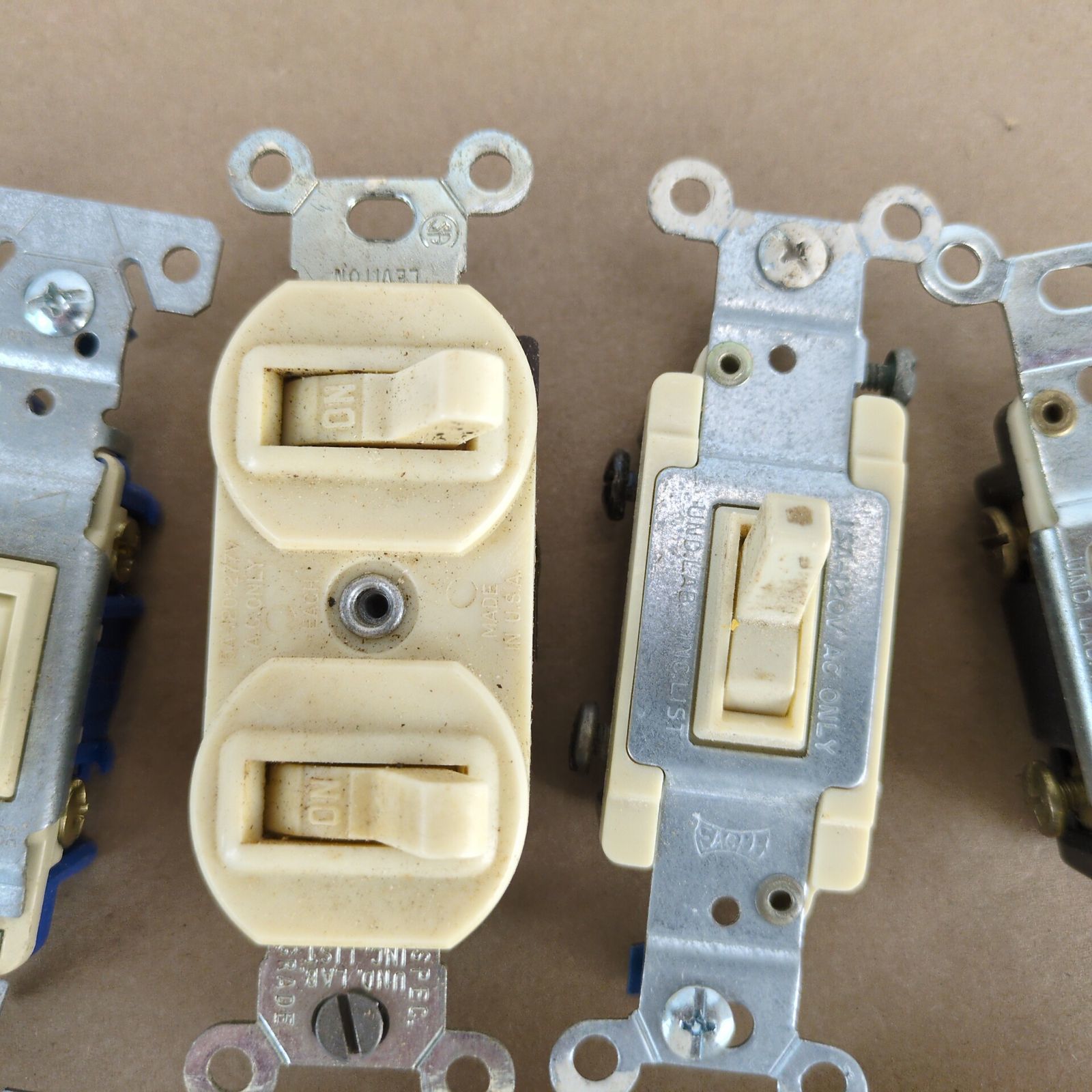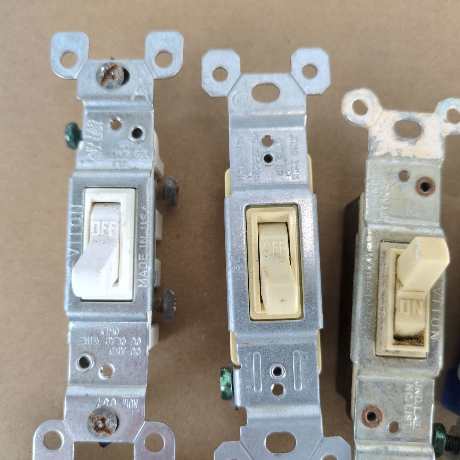 Previously used condition, vintage wall switches. Most (if not all) made in the USA UL Listed. There are 21 single pole switches and 2 double pole switches. They are almond, white and a few brown. Some feature bakelite housings right up to more modern plastic. Brands include GE, Eagle, Cooper, P S, Leviton, and Slater.