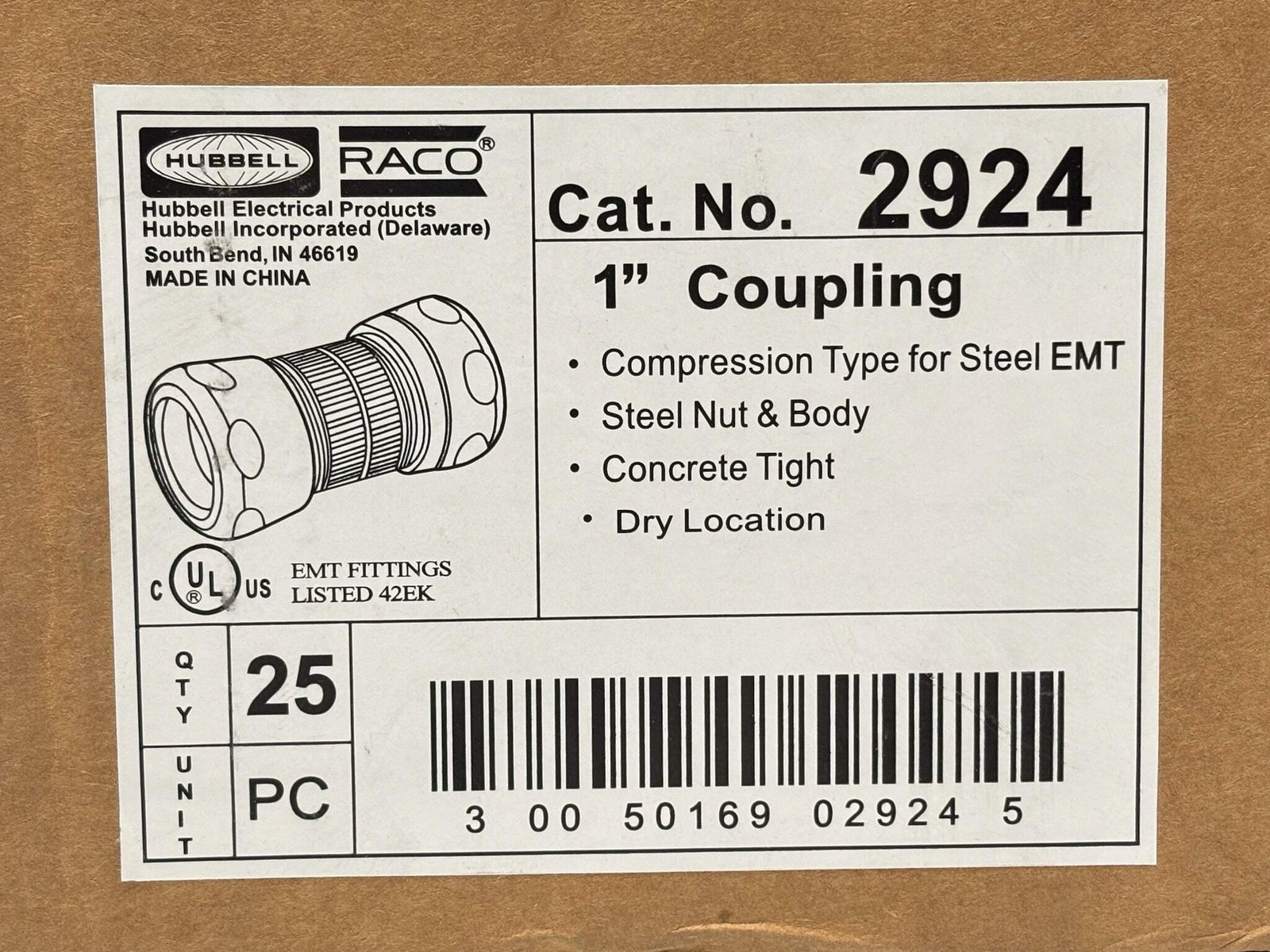 25 PK RACO 2924RT 1? EMT Raintight Compression Coupling, Steel New The RACO 2924RT is a 1? steel compression coupling designed for use with EMT conduit in wet or outdoor locations. It features a zinc-electroplated finish for corrosion resistance and is clearly marked ?Wet Location? for inspection compliance. The coupling provides a concrete-tight, raintight seal for secure and durable conduit connections. UL listed and suitable for electrical systems up to 600 volts. Listed by: Maksim (Sales Team) "Enjoy the little things, for one day you may look back and realize they were the big things.?? Robert Brault (A positive moment brought to you by Help Resale) About Us Welcome to Help Resale, your go-to consignment shop where value meets quality. At Help Resale, we're dedicated to providing you with an exceptional shopping experience, whether you're looking to find the best deals or consign your items. Need to buy a product, but don't see it in our store? Please feel free to reach out to us and we will help you find it! Help Resale 7200 Fair Oaks Blvd Suite 120 Carmichael CA 95608 Business Hours: Monday-Friday: 9:00 am to 5:00 pm (PST) All product and company names are trademarks TM or registered trademarks of their respective holders. Use of them does not imply any affiliation with or endorsement by them.