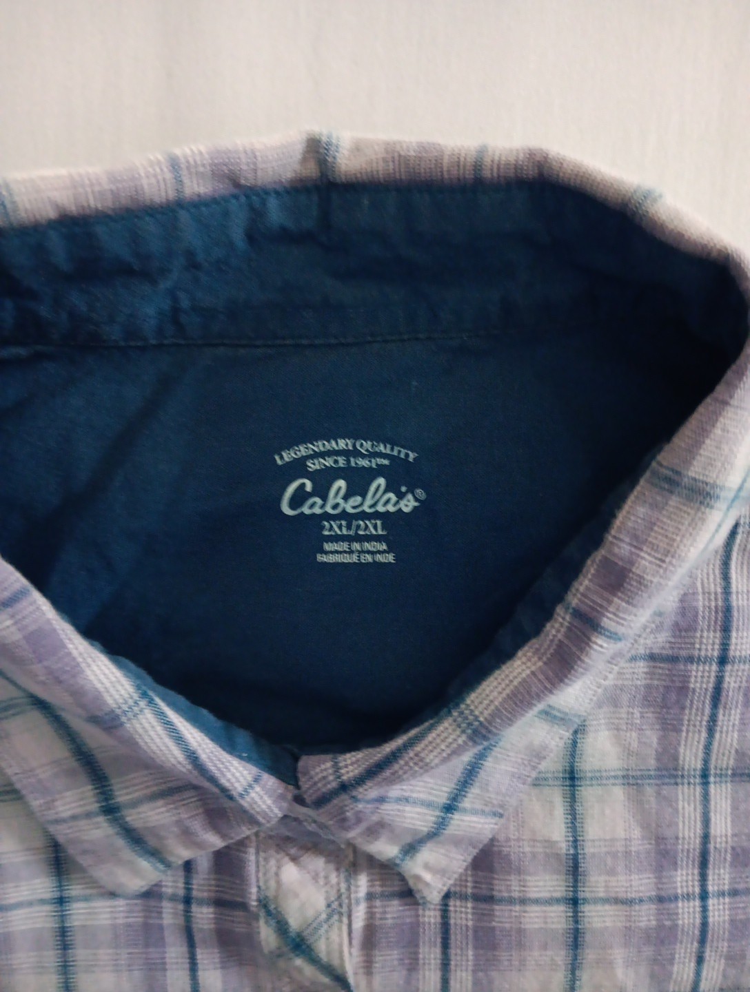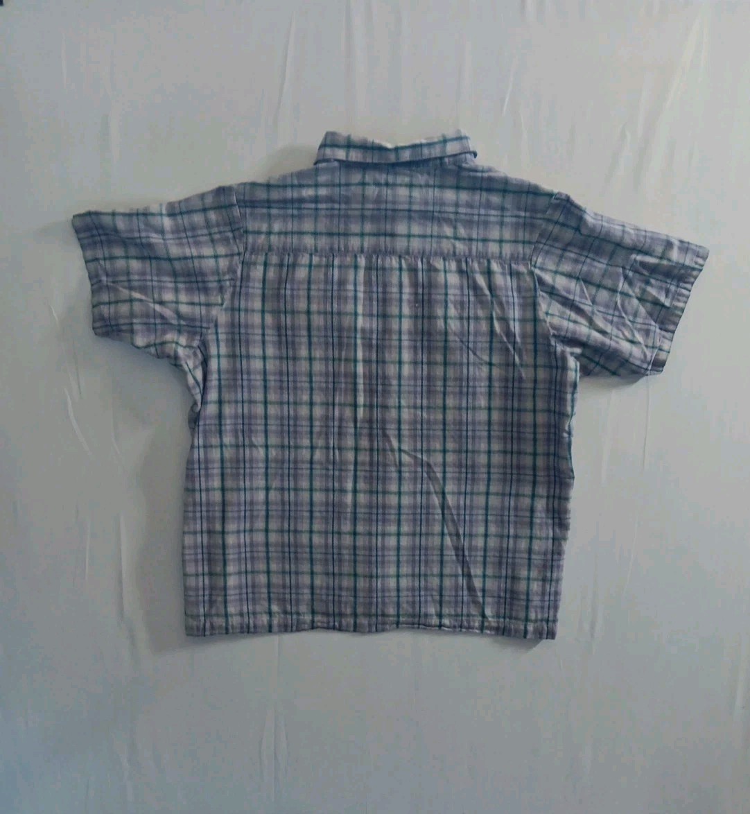 The Cabela's Button Up Fishing Shirt in size 2XL is a versatile and stylish piece for any man's wardrobe. Made from breathable cotton fabric, this shirt features a purple plaid pattern, short sleeves, and a collared neckline with a button front closure. With its regular fit and stand-up collar style, it is perfect for both casual and workwear occasions. The inclusion of pockets adds functionality to this classic outdoor-themed shirt, making it a practical choice. Normal wear.