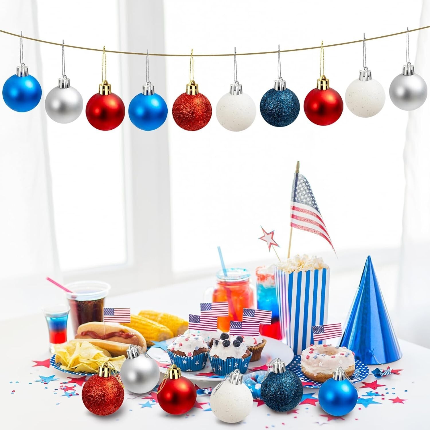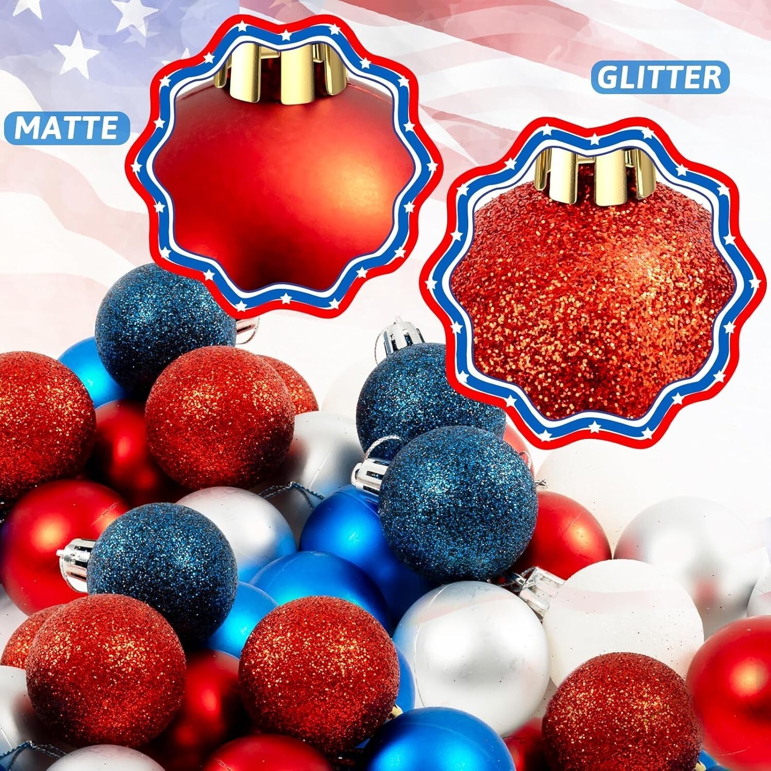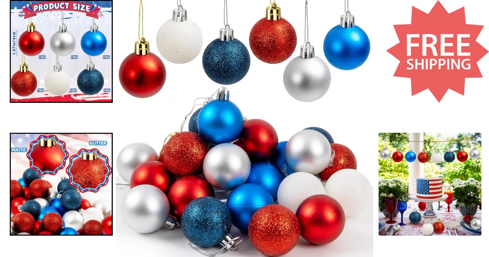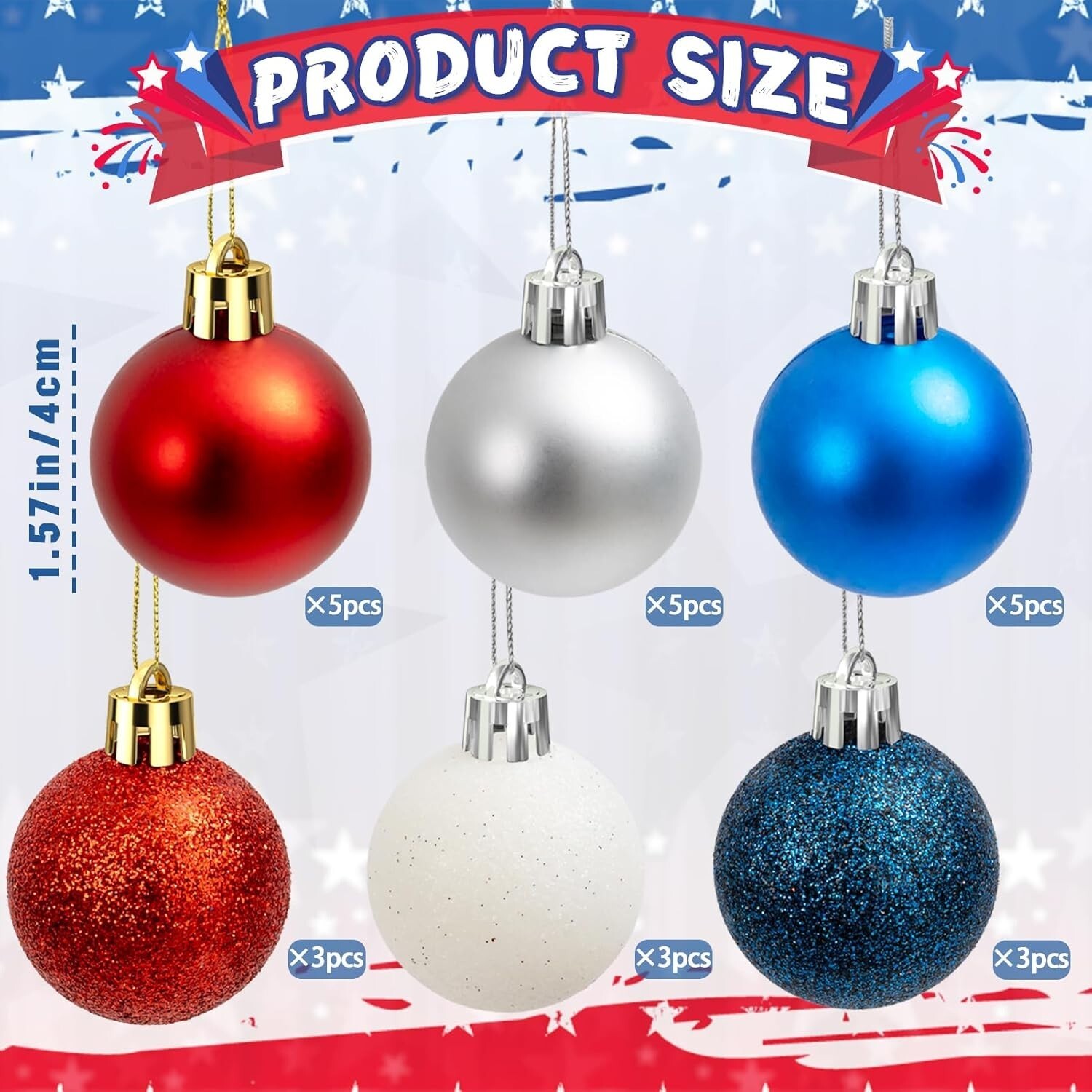 Celebrate Independence Day in style with our 24-piece patriotic ornament set, featuring vibrant red, white, and blue balls in both matte and glitter finishes. Crafted from lightweight yet durable plastic, these decorations are designed to last, maintaining their vivid colors through multiple seasons. Each ornament comes with a sturdy lanyard for effortless hanging on trees, doorknobs, or party decor. Perfect for Independence Day, Memorial Day, or any patriotic occasion, these versatile ornaments add charm and festive spirit to your celebrations. Carefully packaged to ensure safe delivery, the set includes 9 glitter and 15 matte decorative balls, each 1.57 inches in diameter. Elevate your patriotic festivities with these high-quality, easy-to-hang decorations?bringing joy and American pride to any environment. To ensure fast and reliable delivery, we work with multiple fulfillment partners and suppliers. Depending on availability and location, your order may ship from different warehouses or arrive in packaging that varies from item to item. Tracking details are typically provided shortly after shipment, and customer satisfaction remains our top priority. Please note that due to carrier policies and regional regulations, certain items may not be eligible for delivery to specific states or territories.