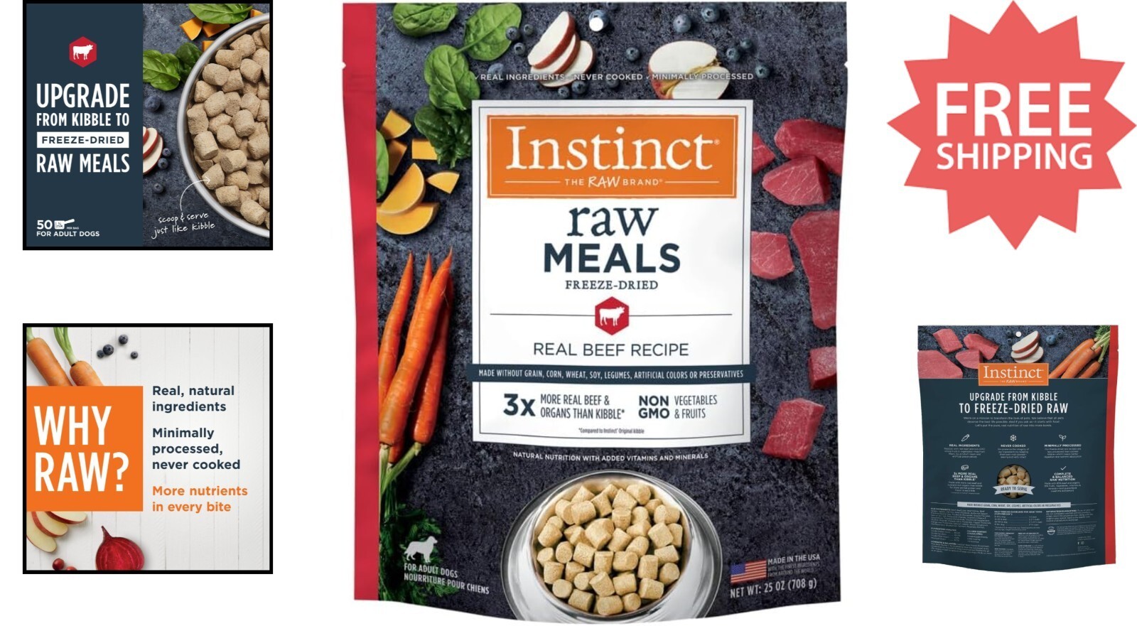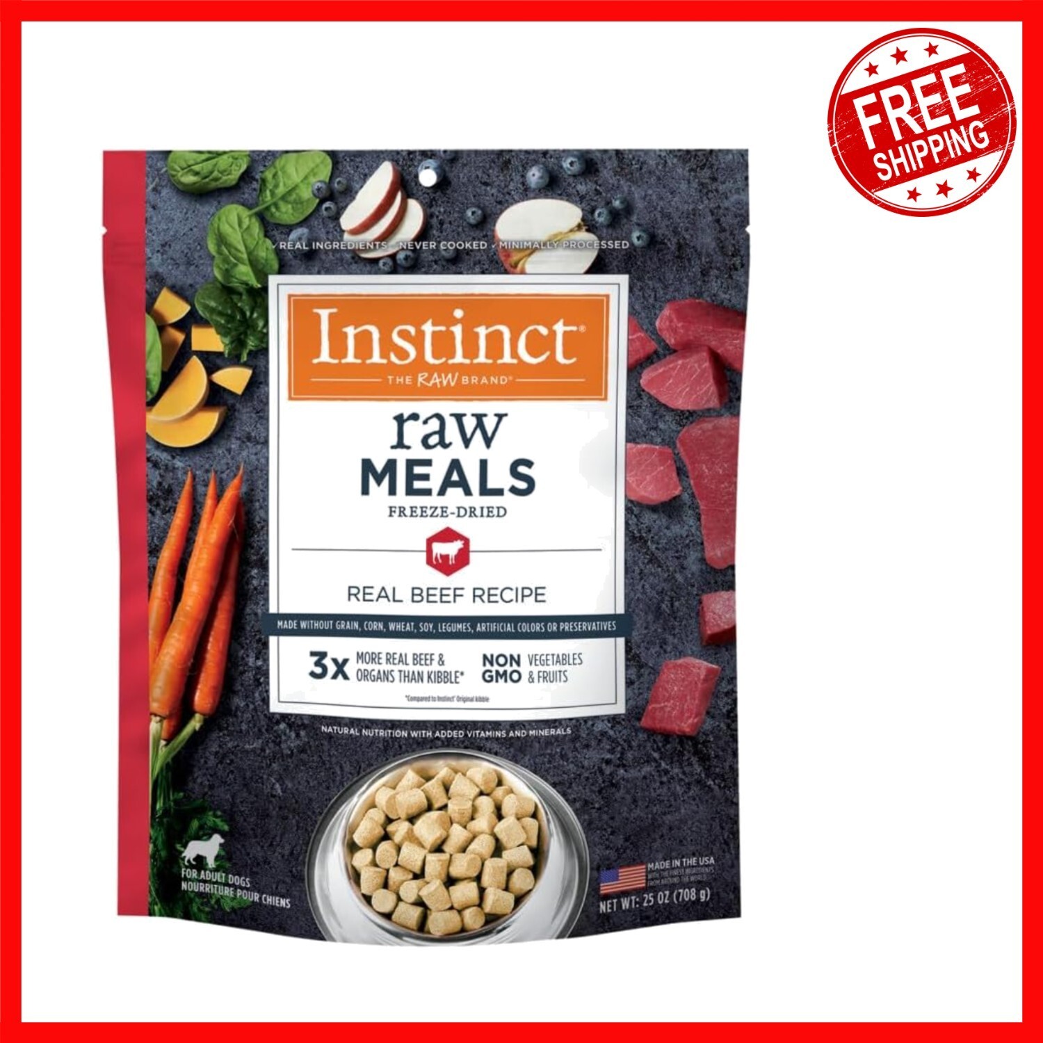 Upgrade your dog's diet with our freeze dried raw dog food?more than 3 times the real meat and nutrient-rich organs compared to traditional kibble. Each bite delivers increased animal-based protein, promoting healthier digestion, lean muscles, and a vibrant coat. Preserved through gentle freeze-drying, our minimally processed recipes retain essential nutrients and are 100% complete and balanced. Grain-free and free from artificial colors, preservatives, soy, wheat, and legumes, this natural food supports overall vitality and well-being. Made in the USA with high-quality ingredients, it's the perfect nutritious alternative for a happier, healthier pet.