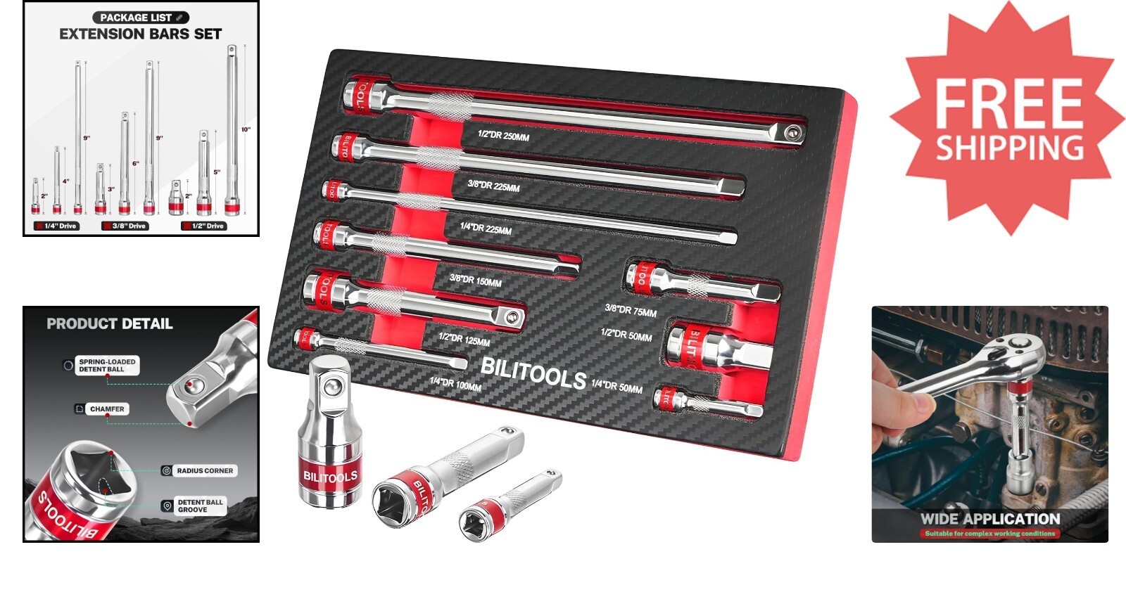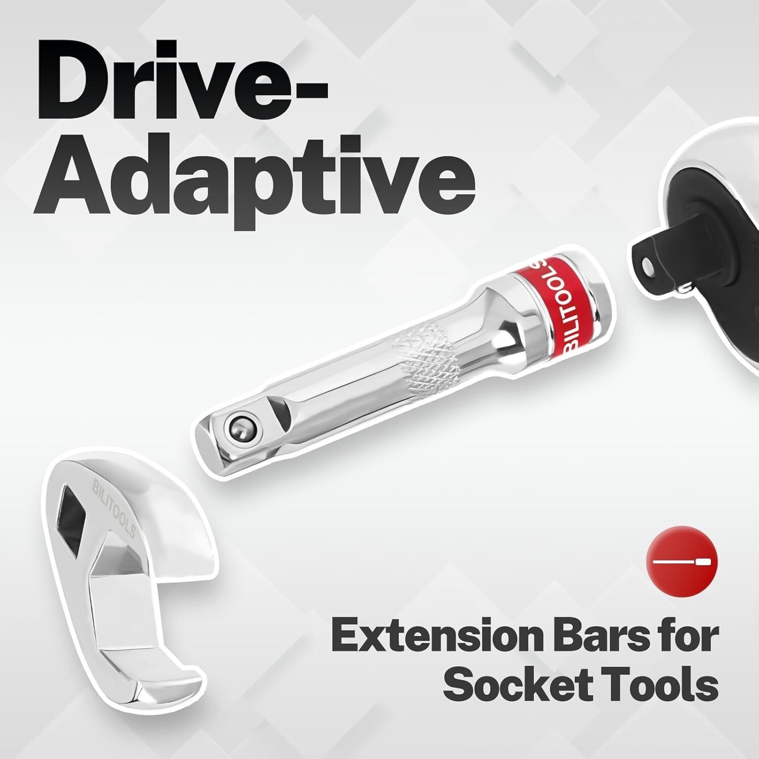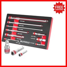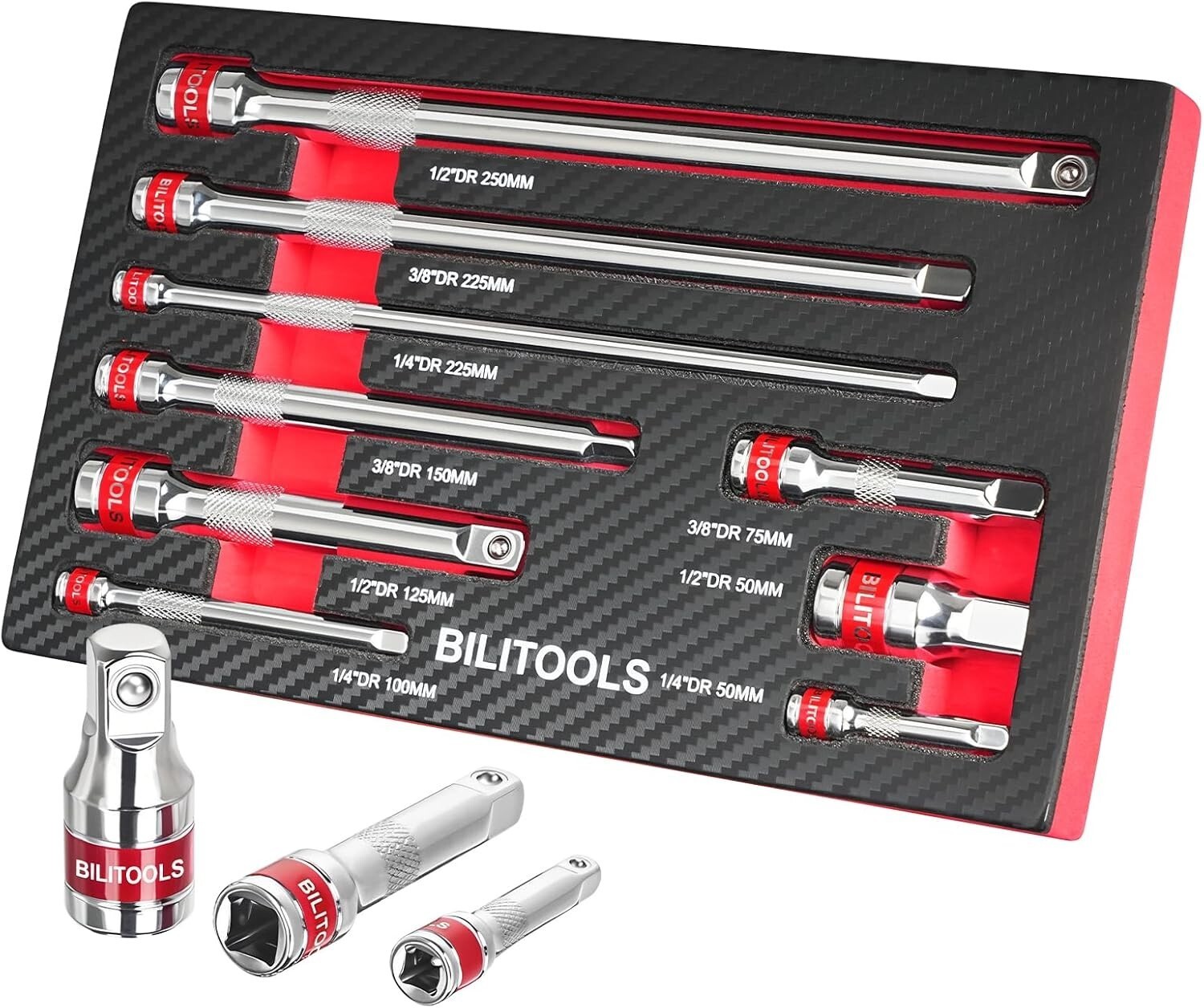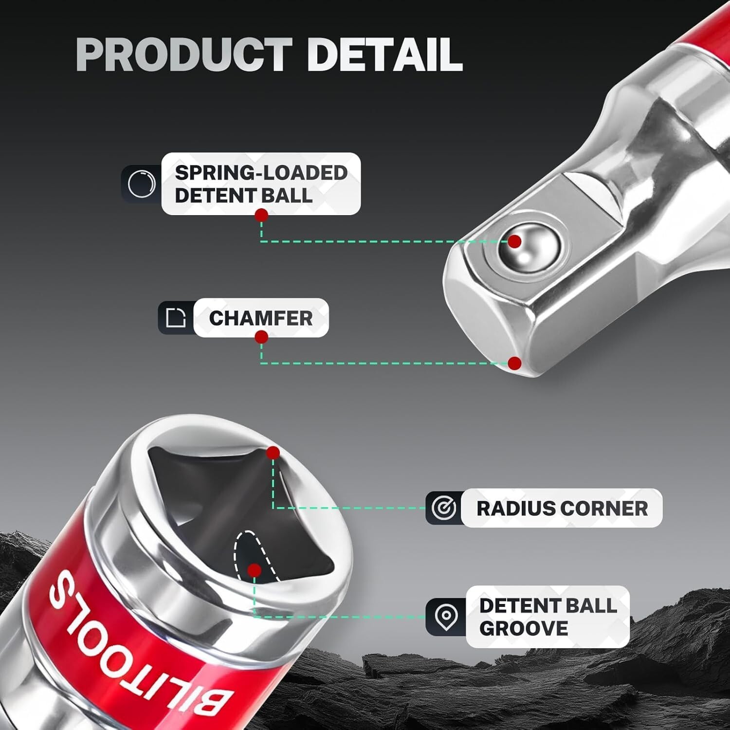 Discover the complete 9-piece socket extension set, crafted for precision and durability. Includes 1/4" (50, 100, 225mm), 3/8" (75, 150, 225mm), and 1/2" (50, 125, 250mm) extensions, catering to a range of industrial and automotive applications. The square-end design ensures high-precision torque transfer with a spring-loaded detent ball for secure locking. Features a robust drive head with internal grooves and stress-relief radius corners for maximum torque capacity. Made from mirror-polished chrome for corrosion resistance, and housed in an EVA foam tray for protection against oil, water, and shocks. Whether for deep-, high-torque tasks or confined spaces, this versatile set enhances your toolkit. BILITOOLS Spring Sale
