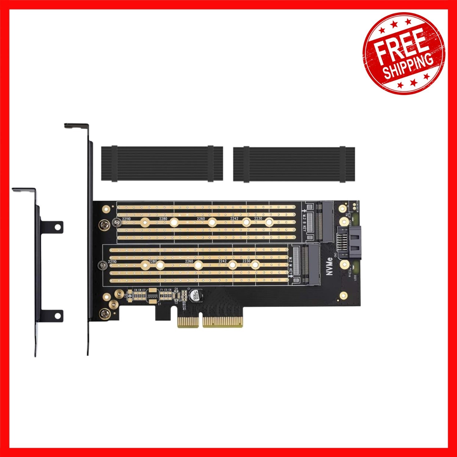 Upgrade your system with our versatile M.2 SSD adapter, supporting simultaneous installation of one SATA and one NVMe SSD. Easily convert an M.2 NVMe (M Key) to PCIe 3.0 x4 or an M.2 SATA (B or B+M Key) to a SATA 6Gbps interface with plug-and-play convenience?no driver installation needed. Equipped with an advanced heat sink and efficient ventilation, it ensures optimal thermal management. Compatible with various M.2 sizes from 2230 to 22110mm, and includes both standard and low-profile brackets for flexible chassis fitting. LED indicators for power and data transfer provide clear status updates.