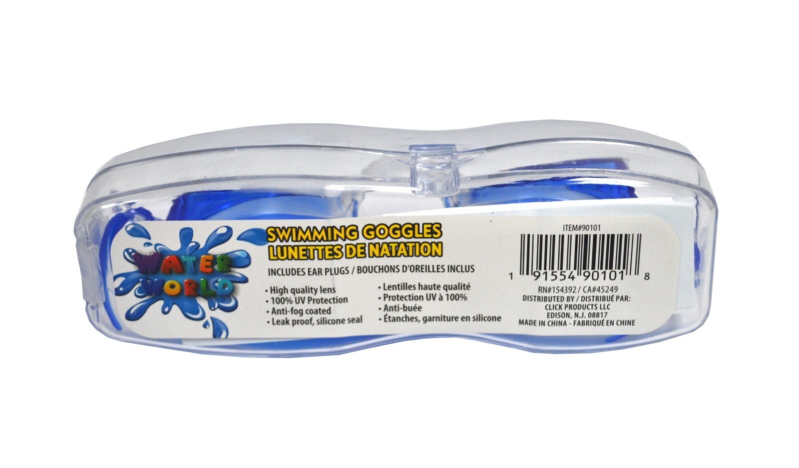 Water World Blue Swimming Goggles. High quality lens. 100 percent UV protection. Anti-fog coated. Leak proof, silicone seal. Adult size goggles. Package contains one pair of blue accented swimming goggles in a plastic storage case. Includes ear plugs. DDD-87090BLUE