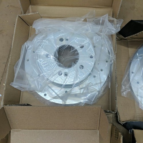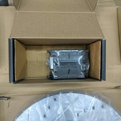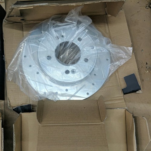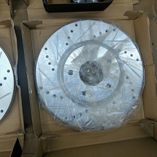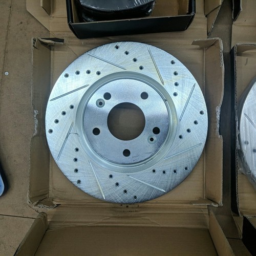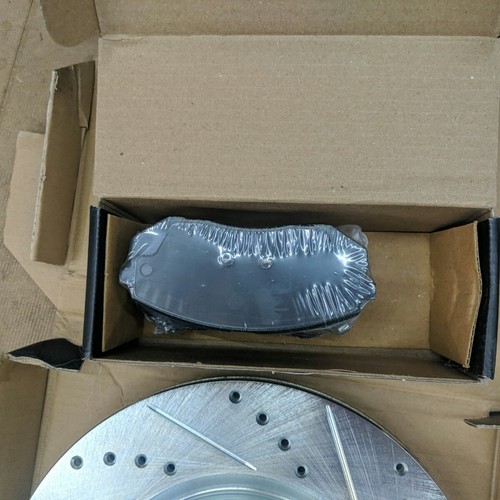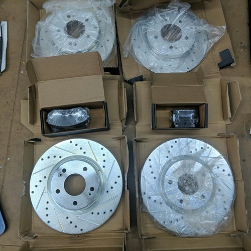 Exact item set is shown. Includes 4 drilled and slotted brake rotors and two sets of ceramic brake pads. New open box with partial original packaging. Vented front rotors, solid rear rotors. Brake pads are new in their original sealed inner packaging. Made in China. No returns on installed items or partial sets. This item is a new, opened customer return. It has been inspected and passed quality control to insure the condition described and contents are accurate. Please review actual photos as stock photos are not the actual item, our photos are. You will ONLY receive exactly what is shown in photos, regardless of what might have originally been included. Please review our business policies in our store for information regarding returns, shipping and warranties.