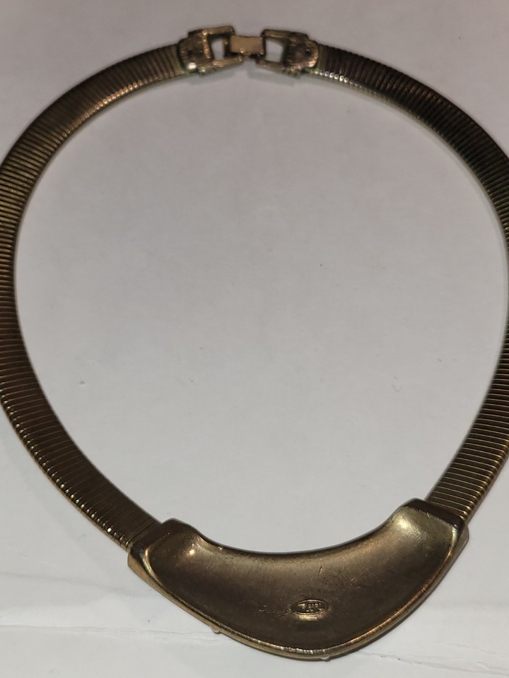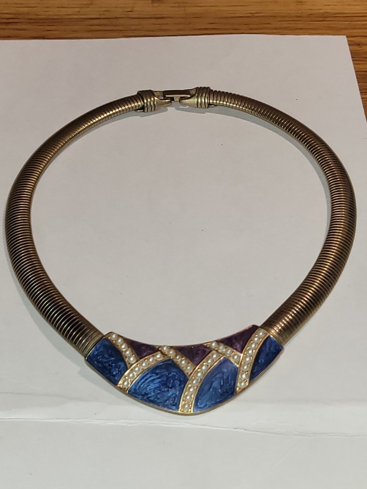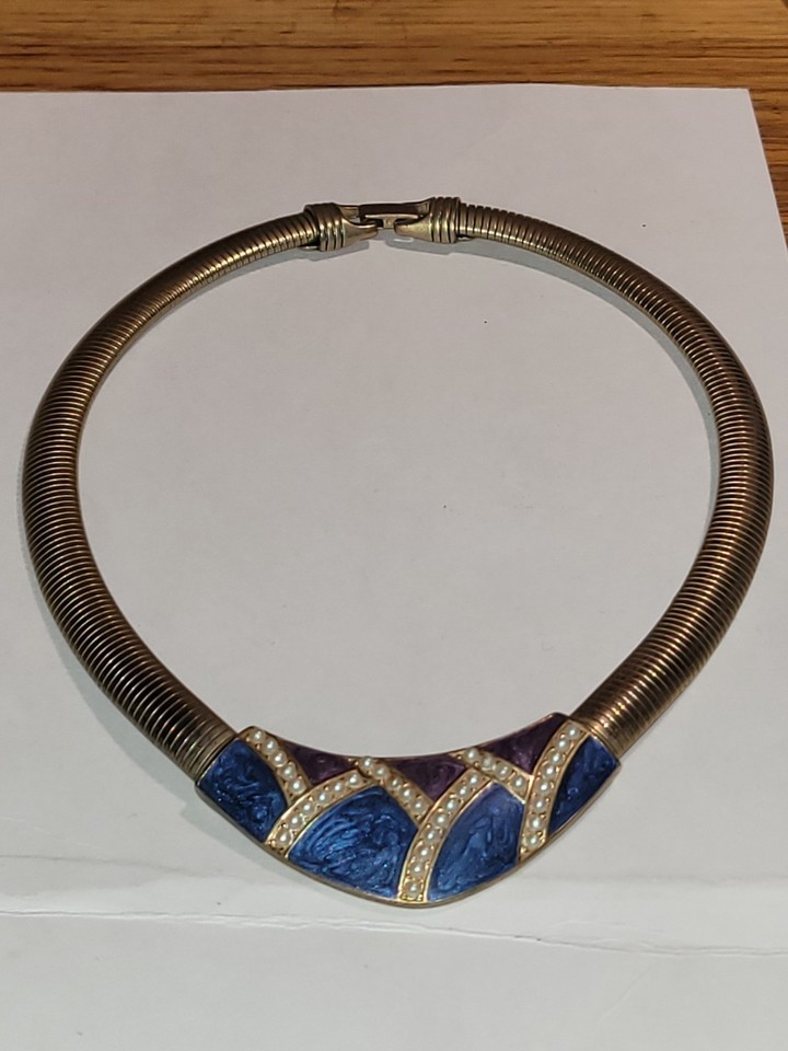 Vtg. TRIFARI Signed Faux Pearl , Purple Blue Enamel Gold Tone Omega Necklace 18”