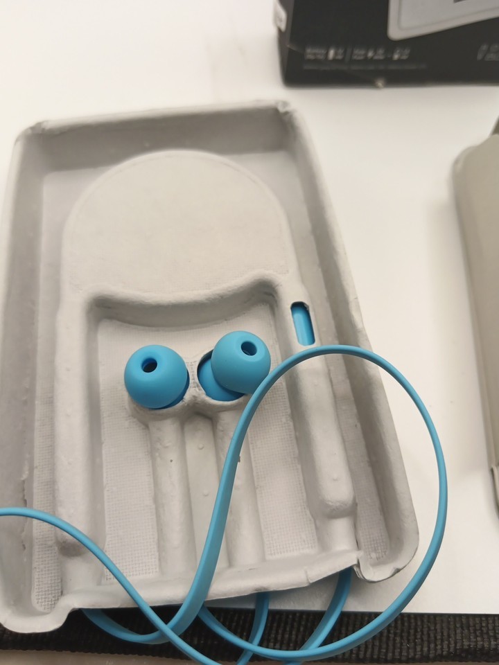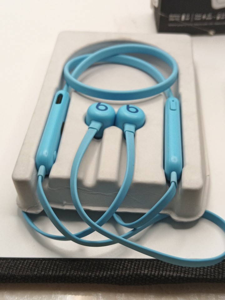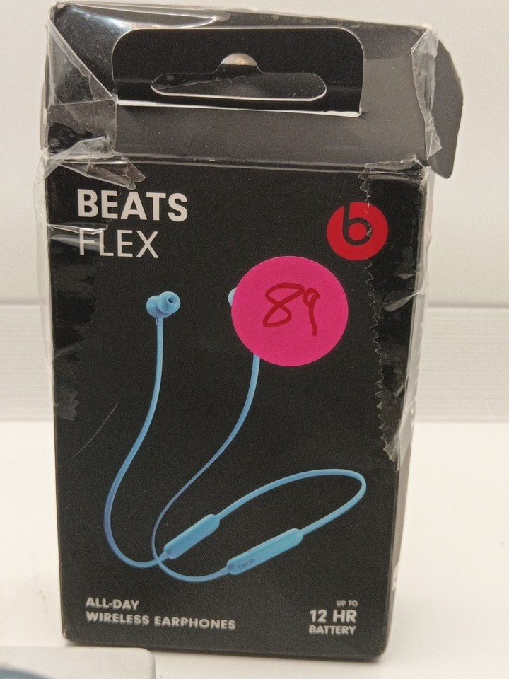 The Beats Flex In-ear Neck-band Headphones are wireless Bluetooth earphones designed by Beats by Dr. Dre. These earbuds provide a sleek and comfortable in-ear fit, with a neck-band for easy wearing. The earphones come in a stylish blue color and offer Bluetooth connectivity for hands-free use. With the Beats by Dr. Dre Flex model, users can enjoy high-quality sound and a seamless wireless experience for all their portable audio needs. Box has seen better days. Tested and working as it should
